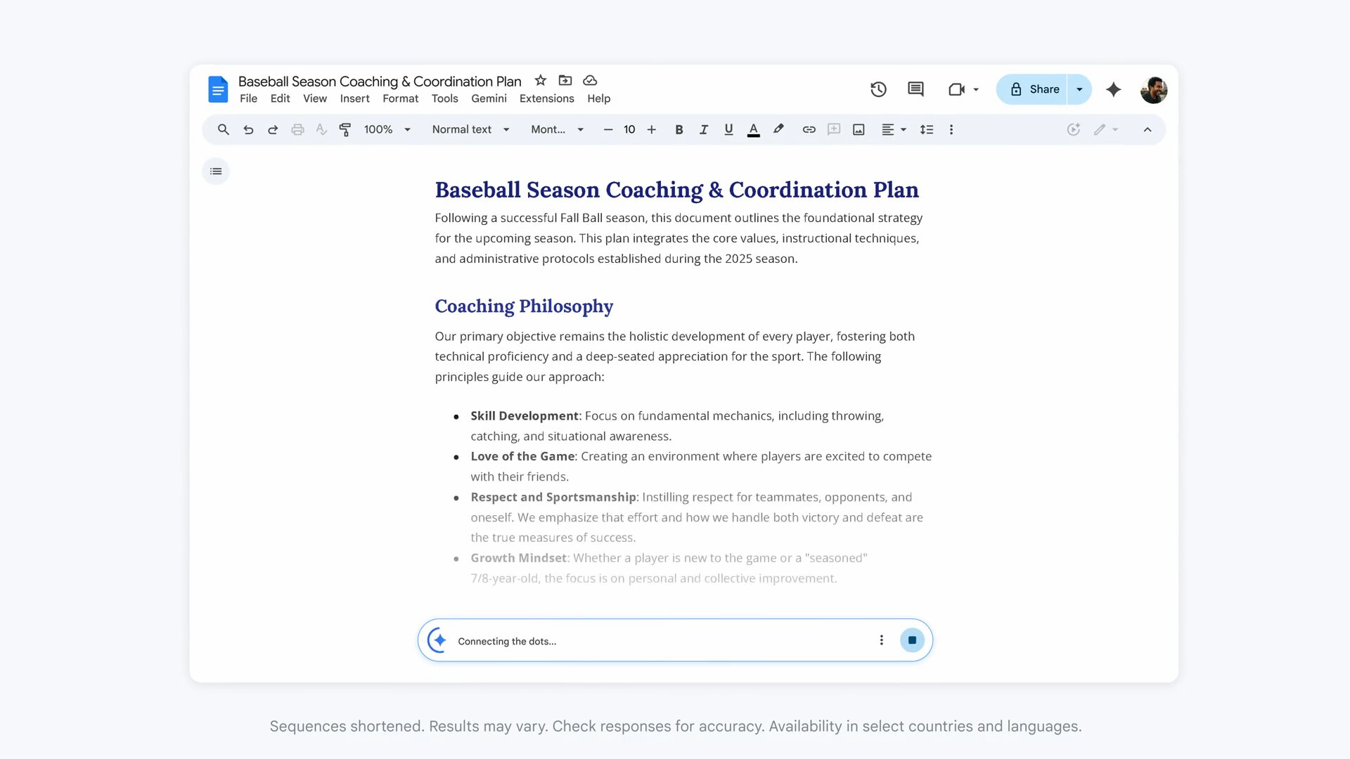 Если после первоначальной генерации необходимо внести какие-то корректировки, всё это делается самым простым запросом. Так, например, пользователь может выделить отдельные разделы и попросить Gemini сделать так, чтобы они соответствовали цветовой схеме остальной части документа. Также в Google обещают, что очень скоро их искусственный интеллект научится создавать не только отдельные слайды, но и целые презентации.