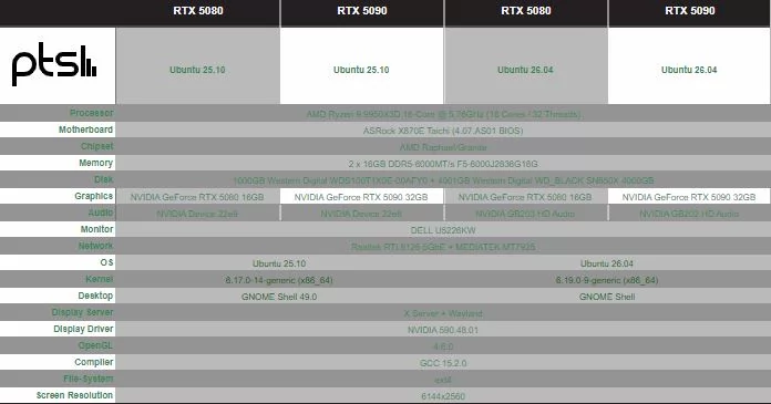 Для выявления различий в производительности между Ubuntu 25.10 и Ubuntu 26.04 при использовании одного и того же драйвера NVIDIA 590.48.01 на двух видеокартах GeForce RTX 50 Blackwell были протестированы различные игры и графические бенчмарки для Linux, как нативные, так и запущенные через Steam Play (Proton).