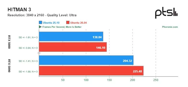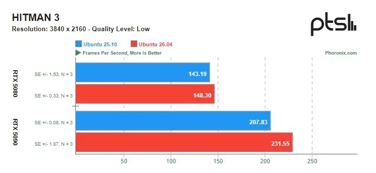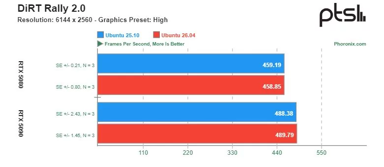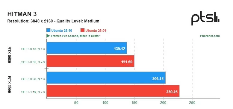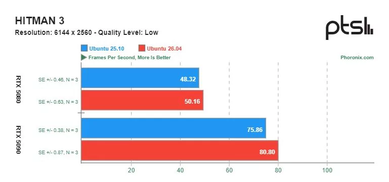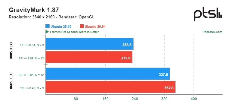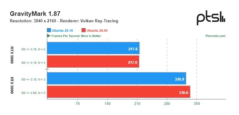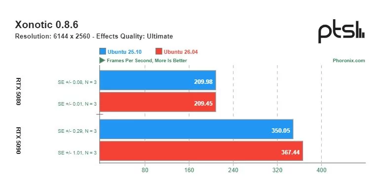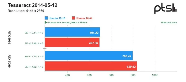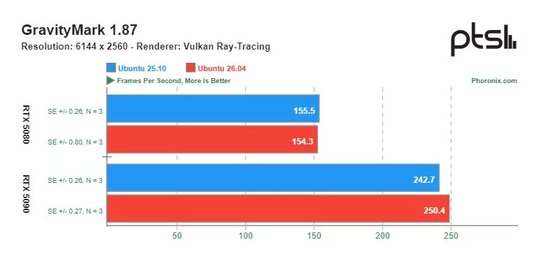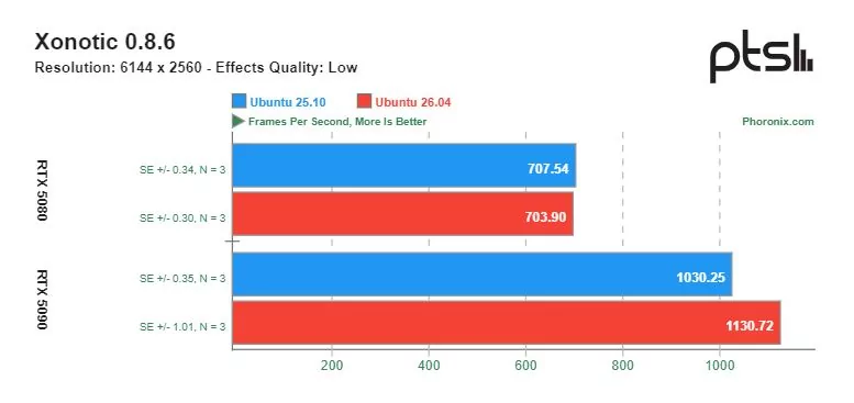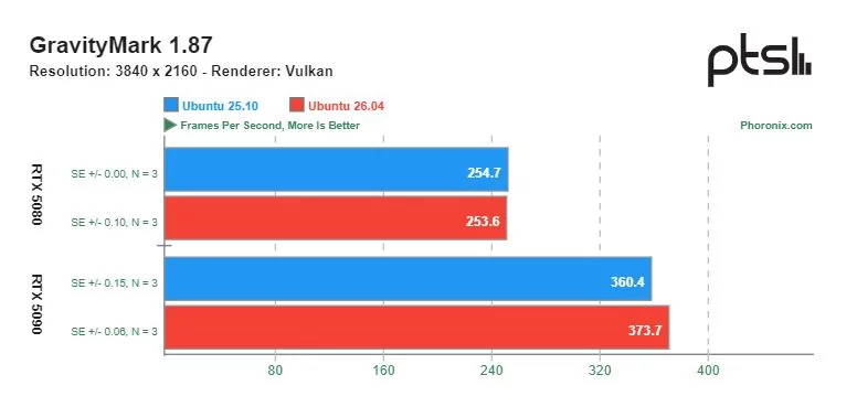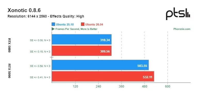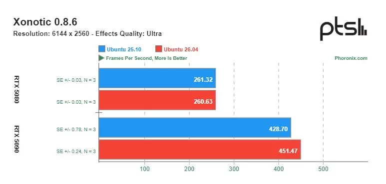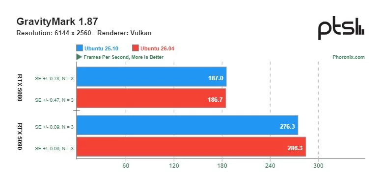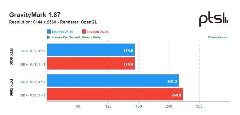 Ощутимую разницу в скорости можно увидеть в играх с открытым исходным кодом, разработанных специально под операционную систему Linux. Видеокарта GeForce RTX 5090 показывала более высокую производительность на Ubuntu 26.04 по сравнению с Ubuntu 25.10. Однако производительность GeForce RTX 5080 в этих тестах оказалась сопоставимой.