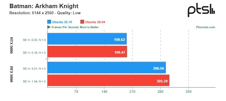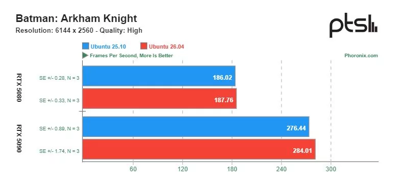 В старой игре Batman Arkham Knight (также через Steam Play) производительность Ubuntu 26.04 вырастает на видеокарте RTX 5090, и то это преимущество сложно назвать тотальным.