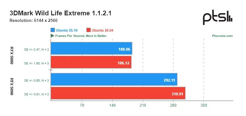 Более заметное превосходство Ubuntu 26.04 над версией 25.10 проглядывается в бенчмарке 3DMark Wild Life Extreme с Vulkan API. И как и в прошлых тестах рост производительности отмечается на видеокарте RTX 5090.