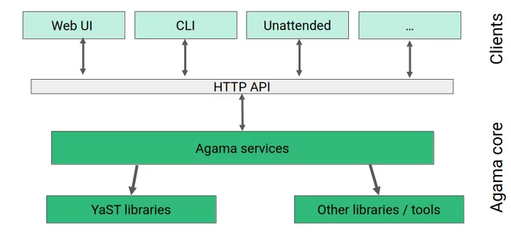В Agama 19 представлена обновленная архитектура с унифицированным API. В предыдущих версиях существовали ограничения, мешавшие разработке стабильного программного интерфейса. Новая архитектура устраняет эти препятствия, позволяя внешним инструментам взаимодействовать напрямую с установщиком независимо от того, используется ли графический интерфейс или командная строка.
