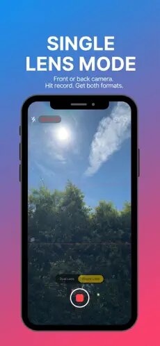 Пользователю нужно всего лишь нажать на кнопку записи один раз, и на выходе он получит два идеально синхронизированных файла, сохранённых в библиотеке устройства. Разрешение — 4K и 1080p при 24, 30 или 60 кадрах в секунду, варианты форматов файлов — MOV и MP4. Из дополнительных опций есть включение / отключение вспышки и возможность видеть свободное на устройстве место в реальном времени.