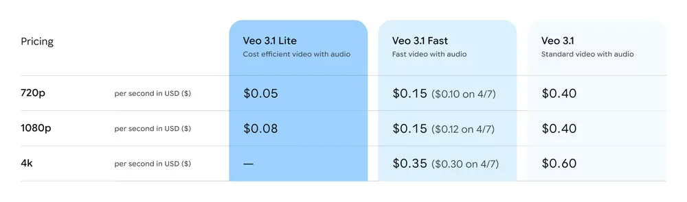 Veo 3.1 Lite поддерживает преобразование изображений и текста в видео с разрешениями 720p и 1080p. На выходе материал может быть как в портретном (9:16), так и альбомном (16:9) форматах, а длина роликов — 4, 6 или 8 секунд. При этом стоимость корректируется соответствующим образом. ИИ-модель обеспечивает ту же скорость генерации, что и Veo 3.1 Fast, но генерация видео обходится в два раза дешевле.