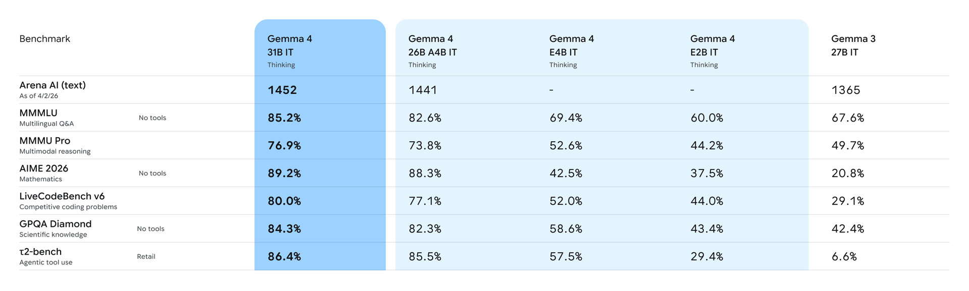- Развитие логического мышления: способная к многоэтапному планированию и глубокой логике, Gemma 4 демонстрирует высокую эффективность в математических задачах и задачах, которые требуют чёткого выполнения инструкций.