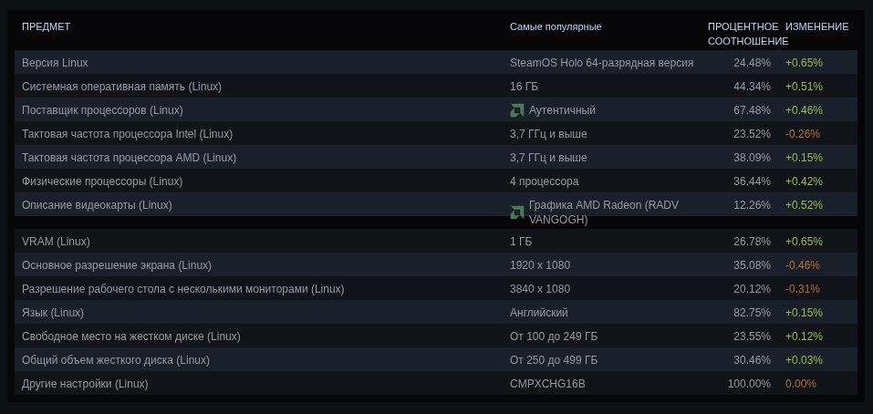 Естественно, самыми массовыми пользователями Steam на Linux остаются владельцы SteamDeck, доля операционной системы от Valve составляет почти четверть от общего числа. Среди других популярных дистрибутивов Ubuntu, Linux Mint и Arch, доля Fedora и Bazzite Linux, предназначенной для гейминга, остаётся неизвестной.