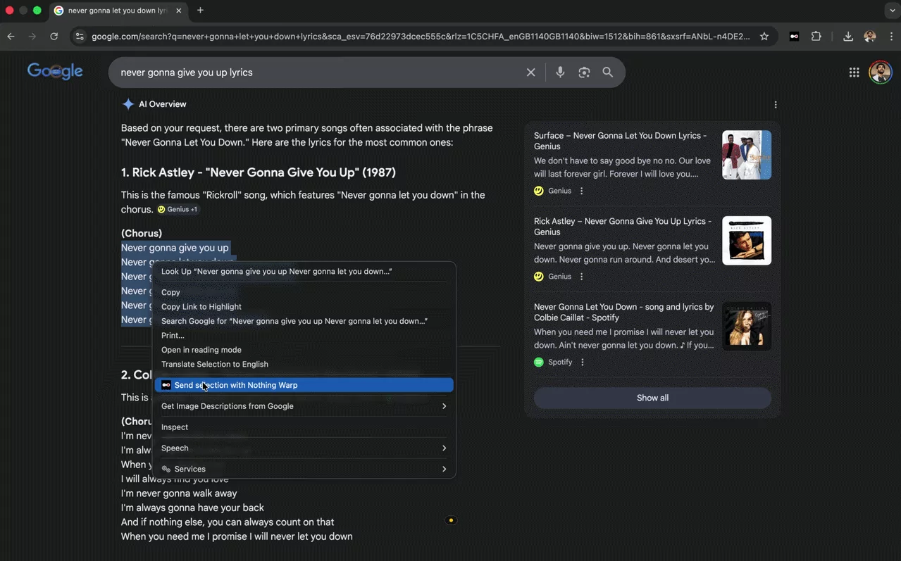 Nothing Warp позволяет передавать файлы, изображения, ссылки и текст в обе стороны — с мобильного устройства на компьютер и обратно. Решение реализовано в виде Android-приложения, которое добавляет функцию Nothing Warp в стандартное меню «Поделиться» и расширения для браузера на базе Chromium, что обеспечивает совместимость с разными платформами. Для обмена данными используется личный аккаунт «Google Диска», поэтому вся информация остаётся под контролем пользователя и не хранится на серверах Nothing. После установки и авторизации в одном и том же Google-аккаунте обмен данными становится практически мгновенным.