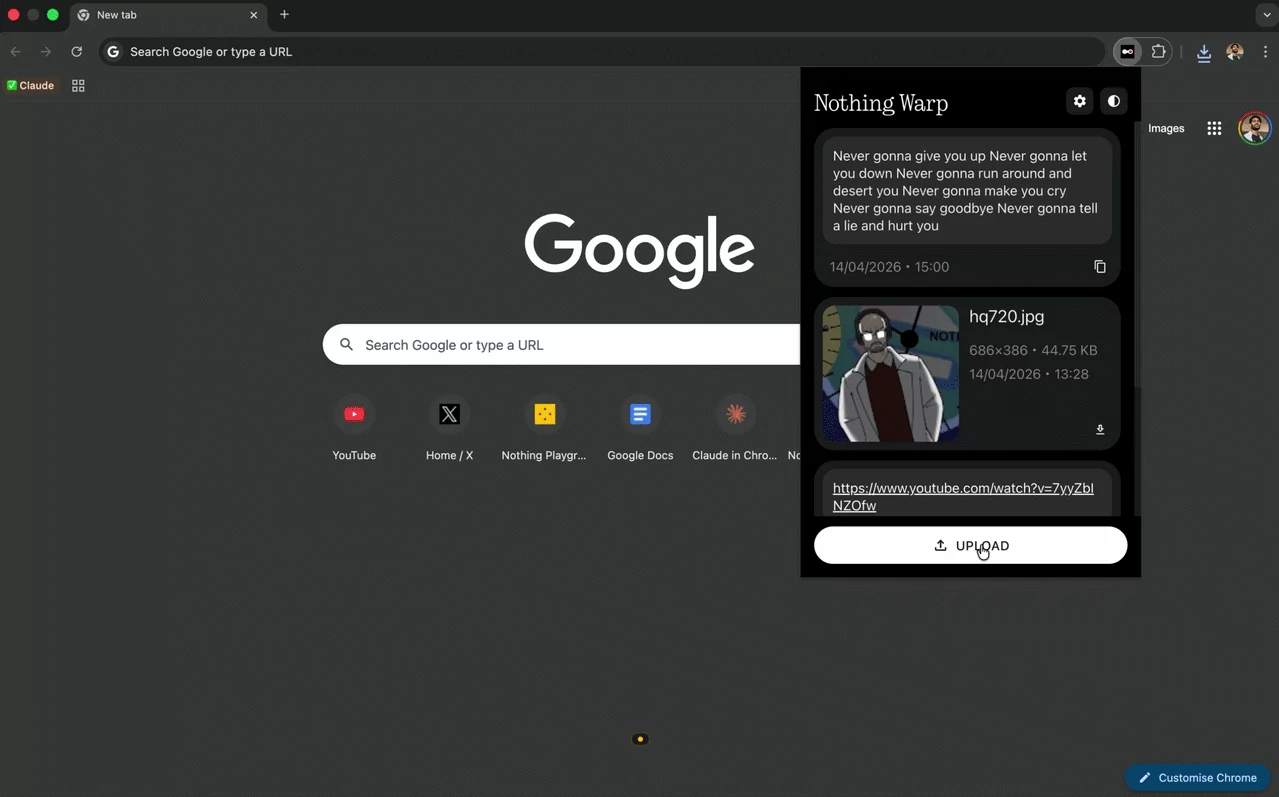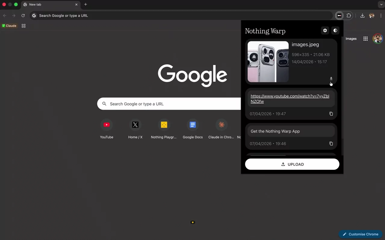 Передача со смартфона на компьютер осуществляется через меню «Поделиться», для этого нужно выбрать функцию Nothing Warp. В обратном направлении доступно несколько вариантов: через интерфейс расширения (кнопка «Загрузить»), контекстное системное меню («Отправить с помощью Nothing Warp») или с помощью вставки содержимого из буфера обмена в окно расширения.