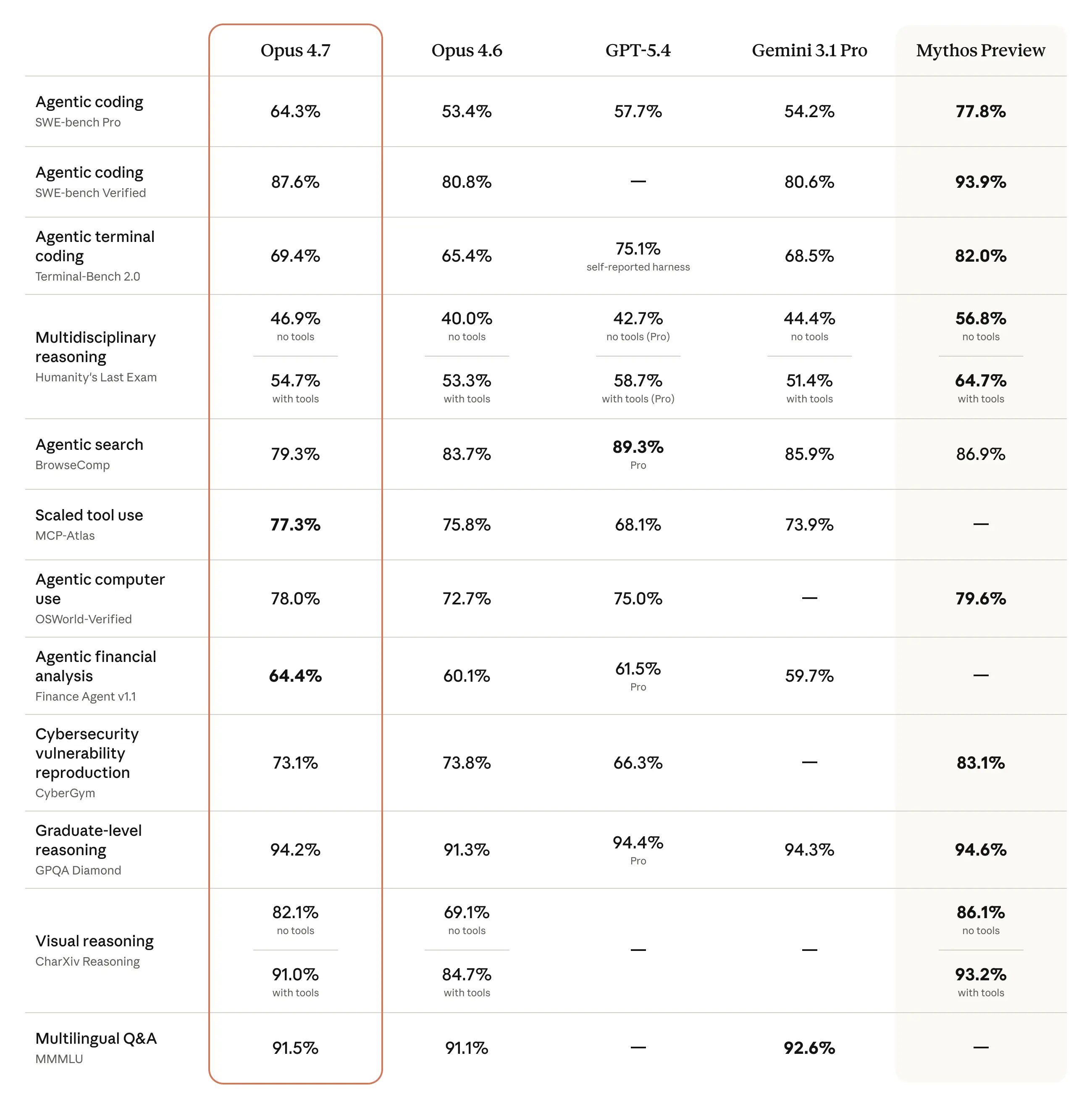 При этом хотелось бы отметить, что Claude Opus 4.7 на данный момент не является самой мощной моделью компании Anthropic — если посмотреть на столбик, который расположен на графике справа, можно заметить Claude Mythos Preview. Эта модель обходит и конкурентов, и Claude Opus 4.7 буквально по всем направлениям, уступая лишь в агентском поиске, но разница в том, что Claude Opus 4.7 является публичной моделью, доступ к которой получат все желающие (после оплаты подписки), тогда как Claude Mythos Preview предоставляется лишь партнёрам Anthropic и за очень большие деньги.