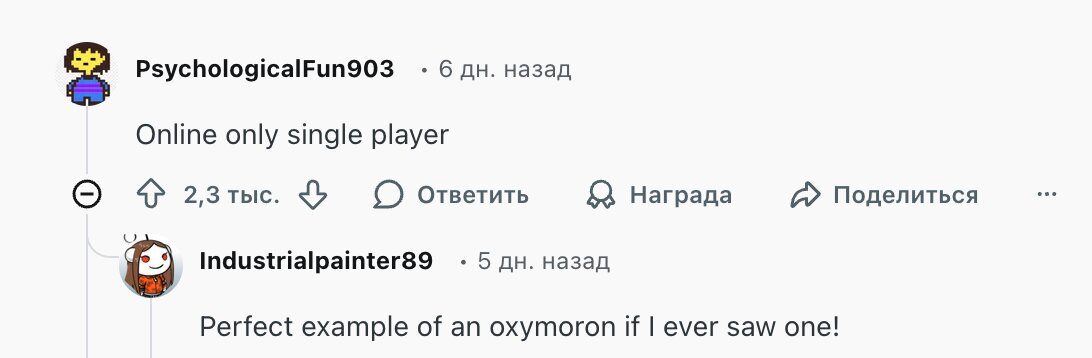 Неделю назад на сабреддите PC Master Race был создан пост о том, какие слова и словосочетания в описании видеоигр моментально снижают интерес геймеров к тайтлу. И эта публикация оказалась крайне популярной среди пользователей форума Reddit — за относительно короткий промежуток времени пост собрал свыше 4 тысяч комментариев, в которых пользователи делились своим списком стоп-слов. Довольно примечательно, что большинство хейтят термин Online only single player («онлайн-однопользовательская игра») — это характеристика одиночных тайтлов, которые требуют постоянное подключение к интернету.
