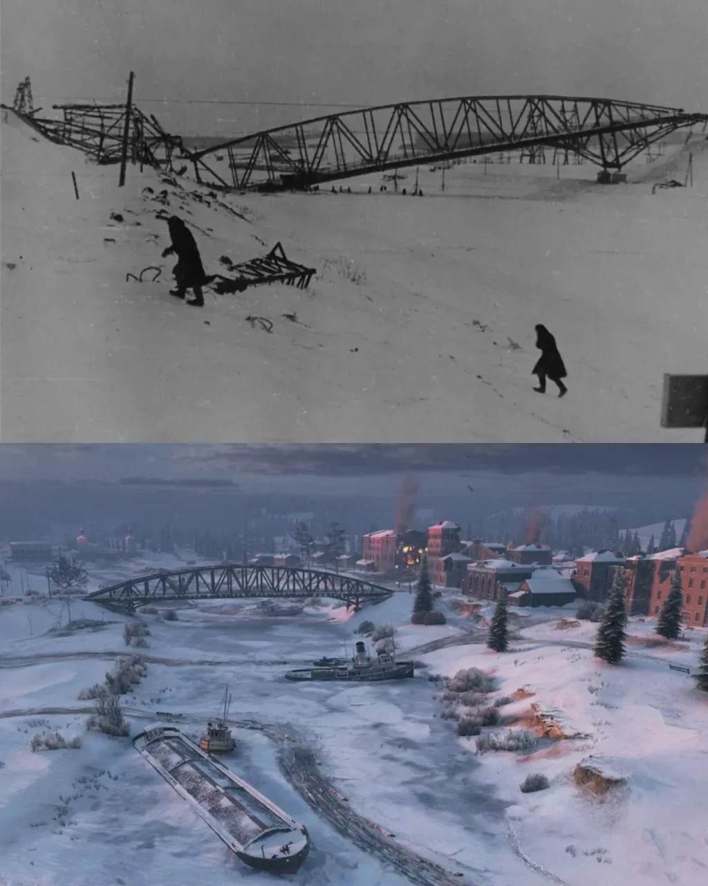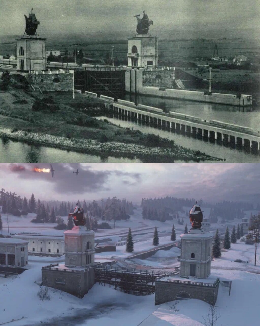 К примеру, особого внимания заслуживает «реконструкция» шлюза — дизайнеры уровней нарисовали в том числе декоративные парусные корабли-каравеллы Христофора Колумба «Санта Мария». Стоит напомнить, что в ноябре 1941 года советские войска были вынуждены подорвать обе башни, отступая под натиском немецких войск, но уже в 1942-м они были полностью восстановлены, включая макеты каравелл.