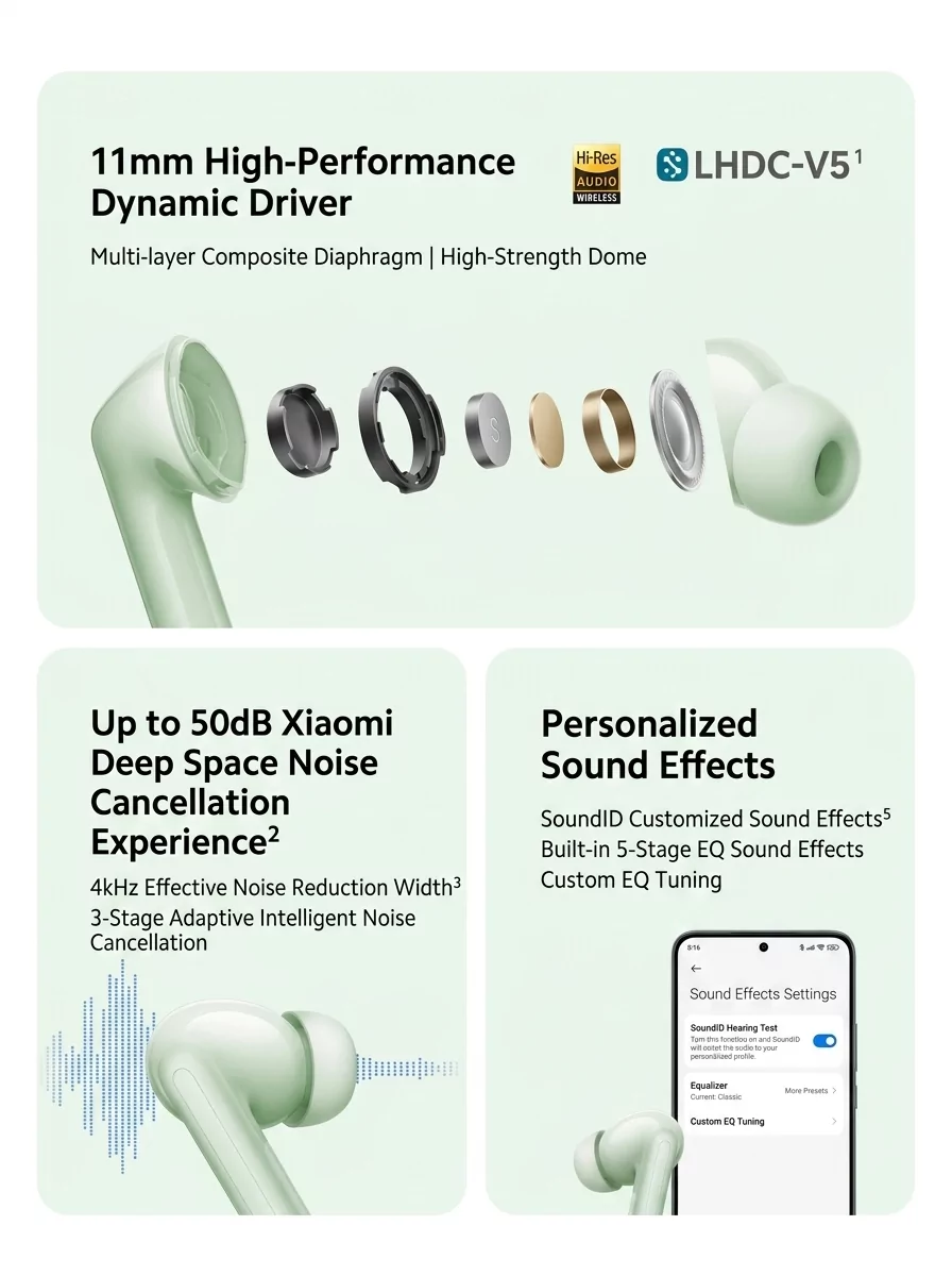 Отдельного внимания заслуживает система активного шумоподавления — представители компании заявили об интеграции системы Deep Space, которая способна подавлять шумы окружающего мира громкостью до 50 дБ с эффективной шириной шумоподавления в 4 кГц. Чтобы добиться этого эффекта, компания задействовала трёхступенчатый адаптивный интеллектуальный алгоритм активного шумоподавления, который умеет адаптироваться под условия окружающей среды. Обычно подобные ANC-технологии получают куда более дорогостоящие модели беспроводных наушников, что, очевидно, позволит новинке REDMI выделяться на фоне конкурентов.