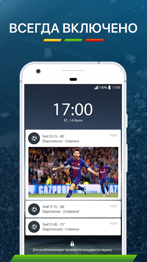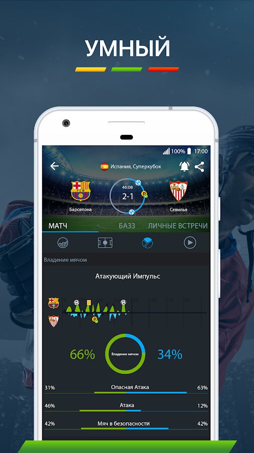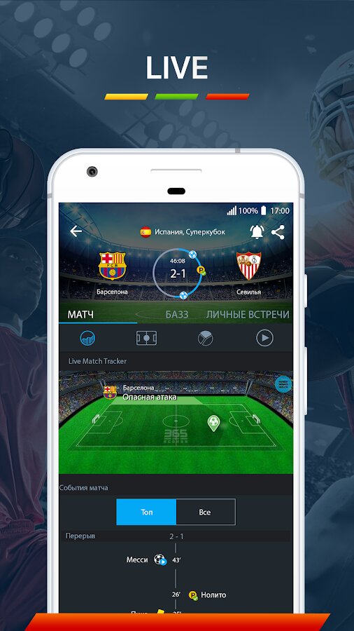 - Мгновенные push-уведомления о ходе игр в реальном времени (гол, красная и желтая карточка, подачи в теннисе и другое).