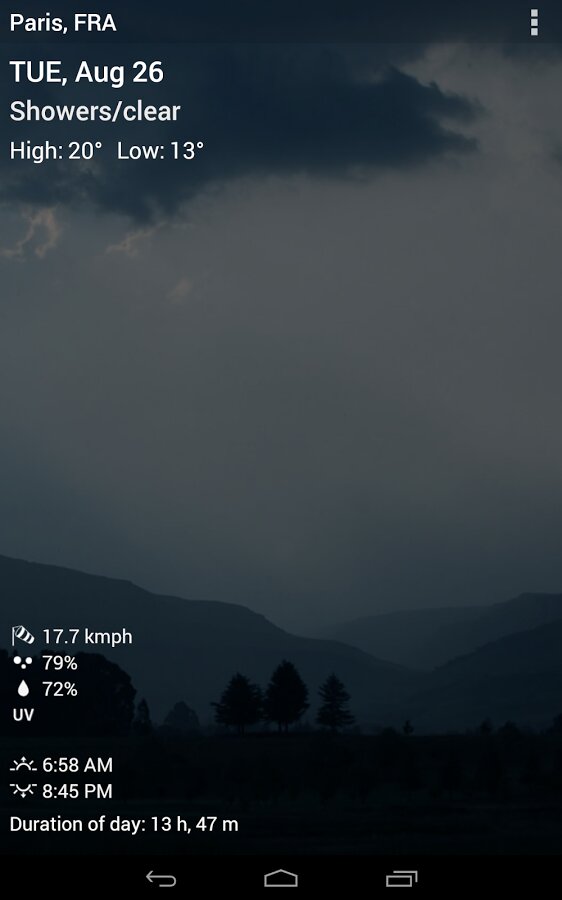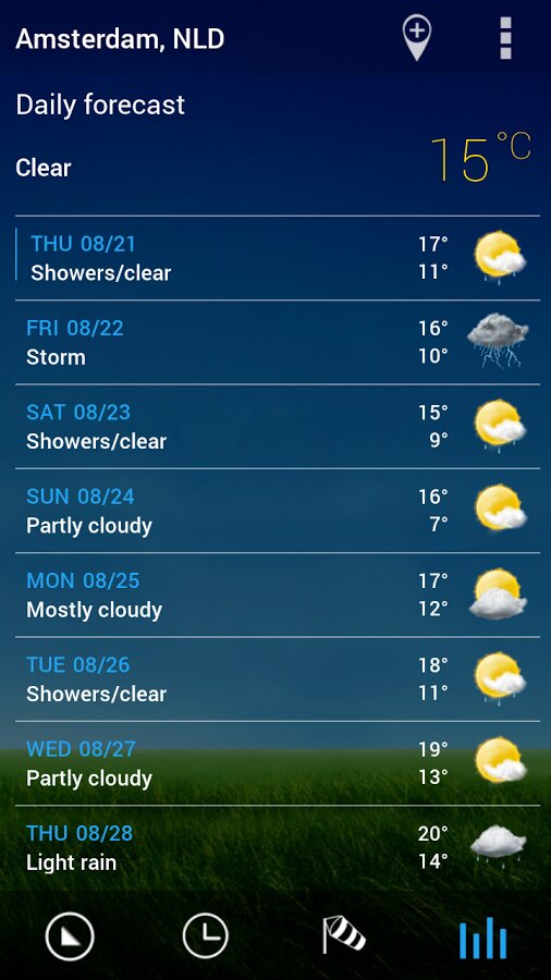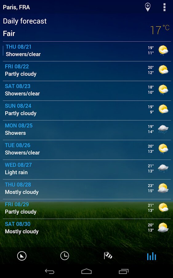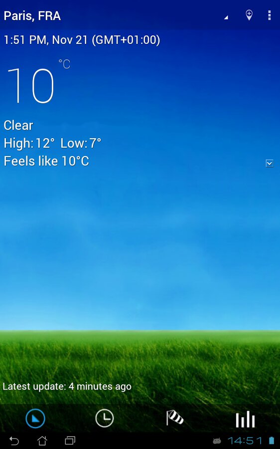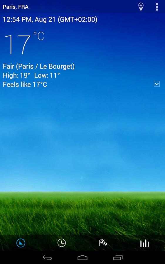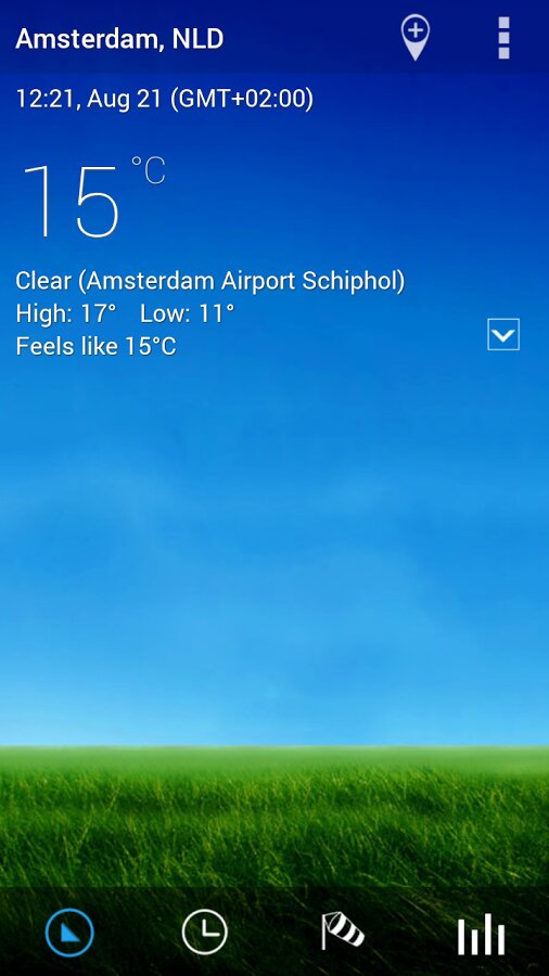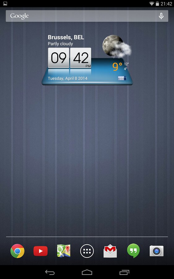 3D Sense Clock & Weather — хороший виджет погоды и часов для Android, который в автоматическом режиме определяет местоположение и погоду в различных городах по всему миру. Размеры виджетов: 4x1, 4x2 и 5x2 полностью настраиваемые. Имеет много настроек, различные скины и иконки погоды, дополнительно отображает будильник и уровень заряда батареи, четырех дневный прогноз погоды с автоматическим или ручным обновлением и т.д.
