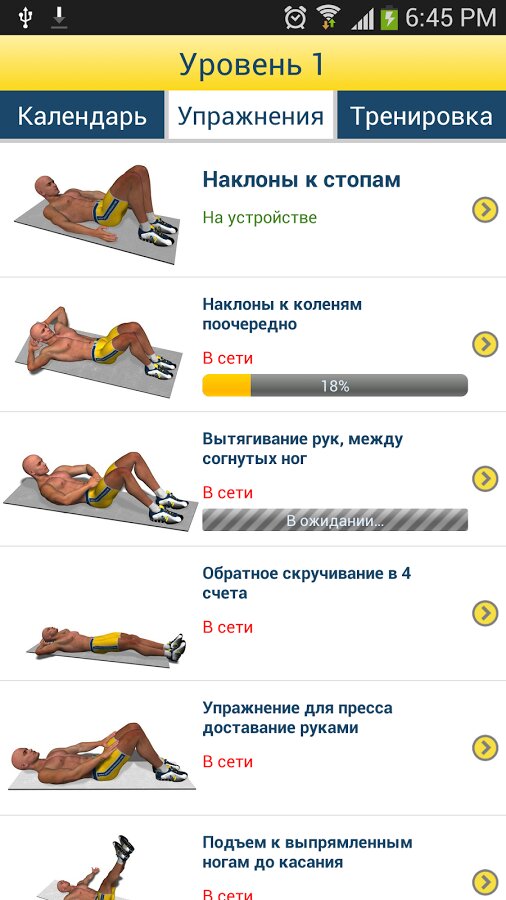 - Список с каждым упражнением который составляют тренировку. Каждое упражнение иллюстрируется с видео.