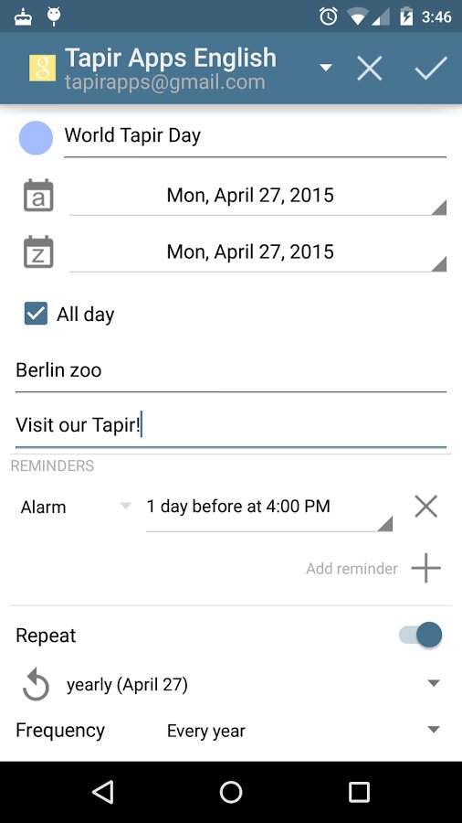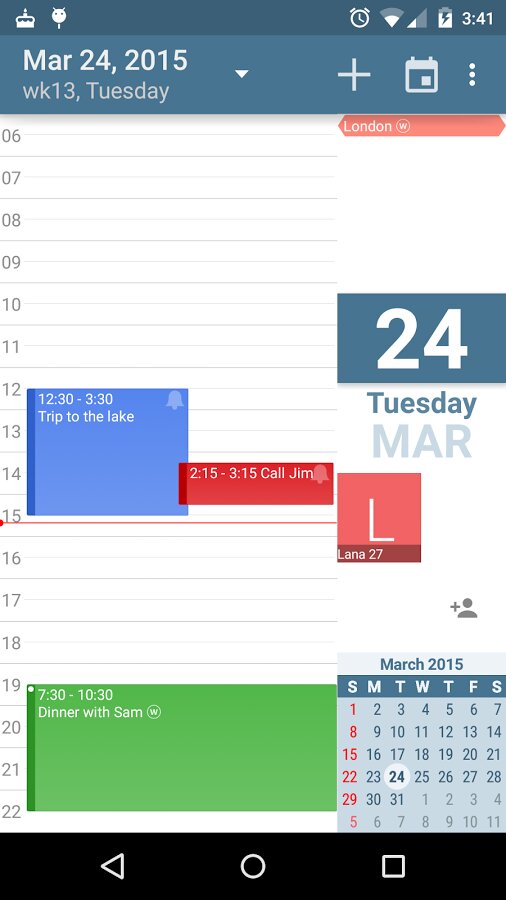 - Использует родной календарь Android и синхронизацию с ним