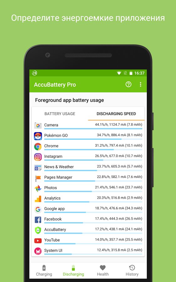 - Узнайте скорость разряда и потребление заряда отдельным приложением.
