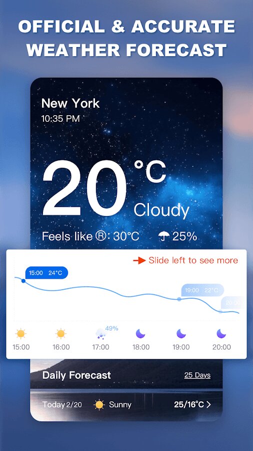 Независимо от того, где вы находитесь, приложение погоды может предоставить вам точную и подробную информацию о прогнозе погоды, включая ежечасный, 72-часовой и 25-дневный прогноз погоды. В то же время вы можете вовремя получать предупреждения об экстремальных погодных условиях и планировать заранее. Вы также можете просматривать подробные местные и глобальные прогнозы погоды в приложении.
