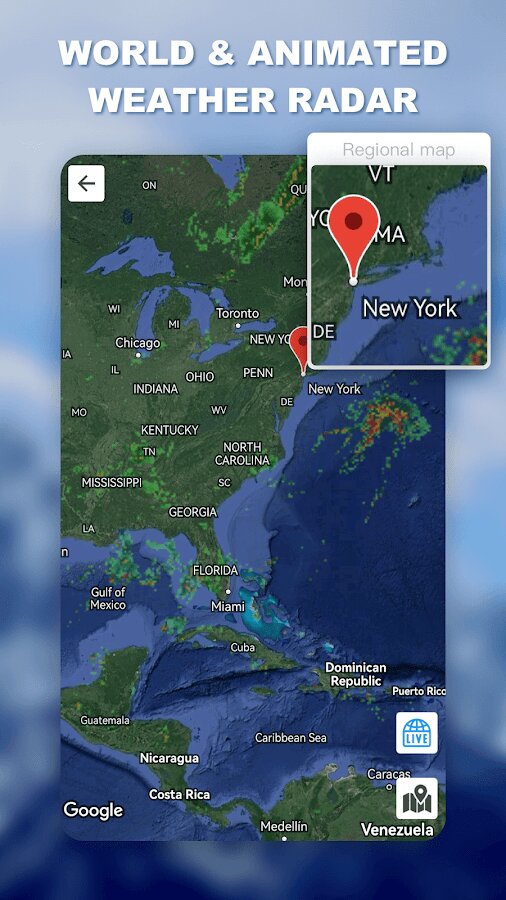 - 💨 Карта метеорологического радара. Используя радиолокационную карту с погодой в реальном времени, вы можете просматривать различные радиолокационные карты, такие как температура и скорость ветра.