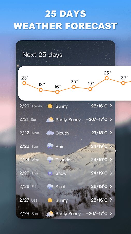 - Узнайте прогноз погоды на следующие 25 дней, узнайте о погоде заранее и спланируйте будущую еду, одежду, жилье и транспорт.