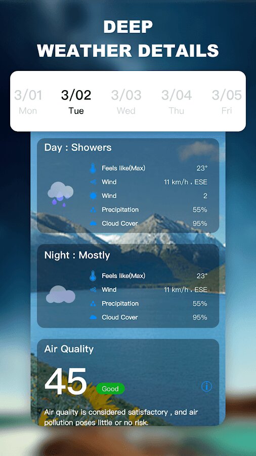 - 🌈 Подробная информация о погоде. Используйте приложение погоды для просмотра подробной ежедневной информации о погоде, включая максимальную и минимальную температуру, время восхода и захода солнца, влажность, УФ-индекс, скорость ветра, направление ветра, качество воздуха и т. Д.