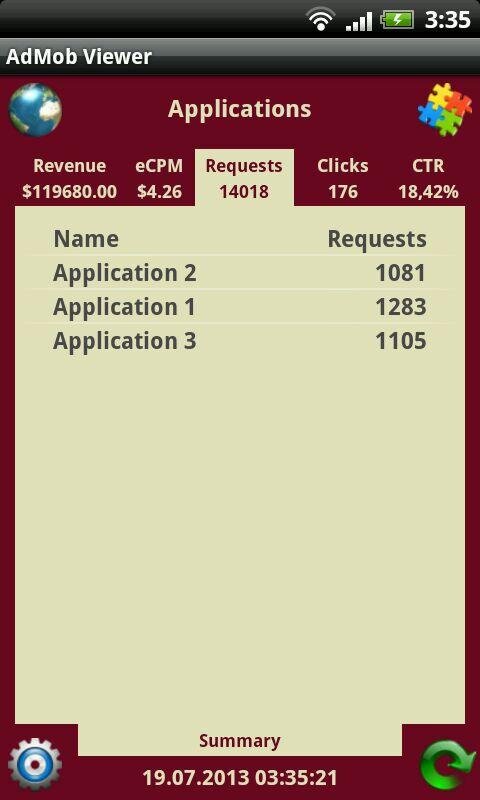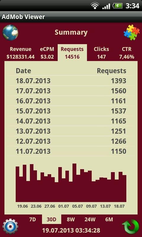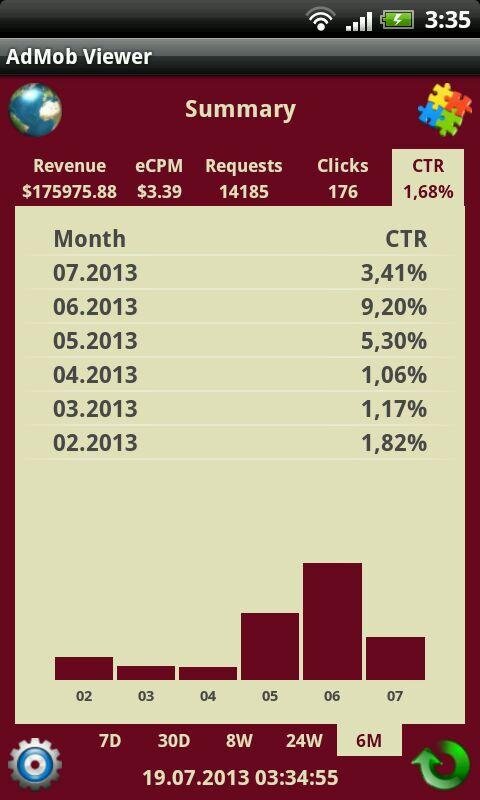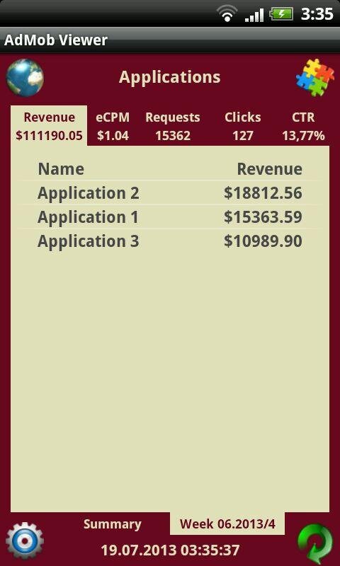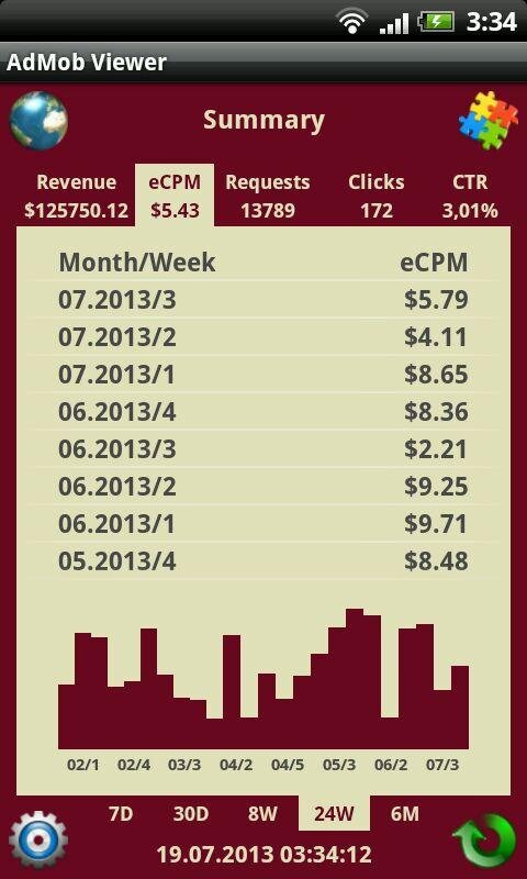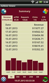 AdMob Viewer – это наиболее функциональный клиент для AdMob. Он собирает наиболее используемые значения AdMob, такие как: revenue, eCPM, requests, clicks и CTR. Приложение позволяет Вам просматривать данные AdMob в табличном виде и используя график (бары). Данные могут быть сгруппированы по дням, неделям и месяцам. Вы можете просматривать как общую информацию, так и данные по отдельному приложению. AdMob Viewer имеет основанный на вкладках дружественный интерфейс, поэтому Вы можете легко переключаться между значениями AdMob и отображаемыми режимами. Он также может вибрировать и/или проигрывать звук при получении денег. AdMob Viewer оптимизирован и для телефонов, и для планшетов, и корректно работает для портретного и альбомного экранных режимов. Приложение может хранить пароль в зашифрованном виде. AdMob Viewer может работать в фоновом режиме с уведомлениями о прибыли (доступно в полной версии).