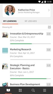 Это приложение также позволяет вам пройти обучение на мобильном устройстве и возобновить его позже на своем рабочем столе в Интернете. Кроме того, с помощью push-уведомлений и объявлений вы не пропустите важные напоминания или сообщения от ваших администраторов обучения.