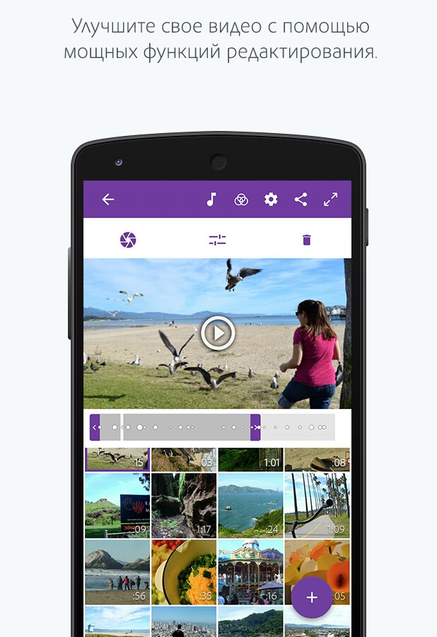 Adobe Premiere Clip — это бесплатный видеоредактор, позволяющий просто и эффективно создавать качественные видеоролики из отдельных клипов. Созданными видеороликами удобно делиться или открывать их в Adobe Premiere Pro CC для финишной обработки.