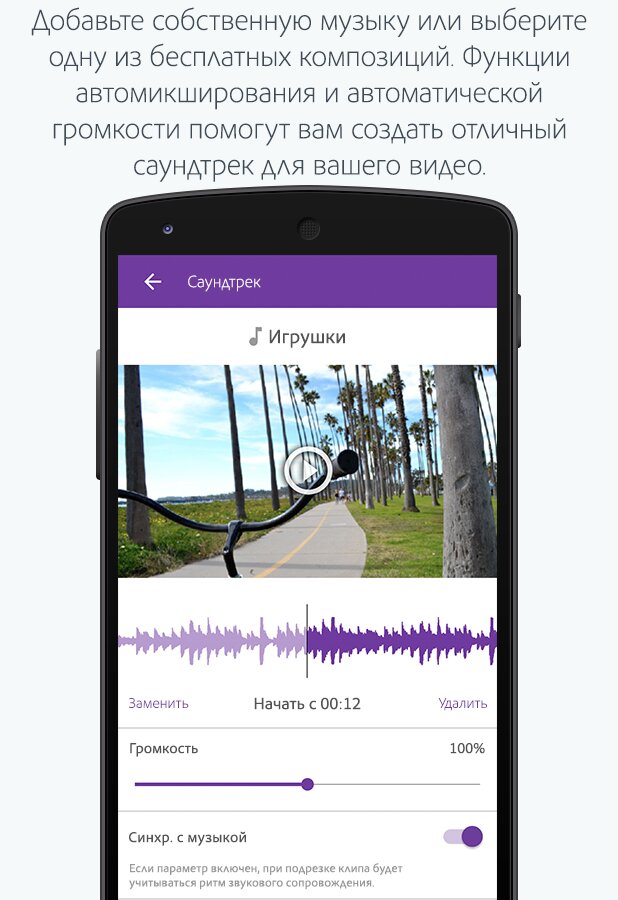 - ПРЕВОСХОДНЫЙ ЗВУК. Выбирайте подходящие саундтреки из числа поставляемых с программой или добавляйте собственные. Функция «умной громкости» сглаживает перепады уровней громкости между клипами, а автоматическое микширование динамически корректирует громкость саундтреков в соответствии с громкостью звука в клипе.