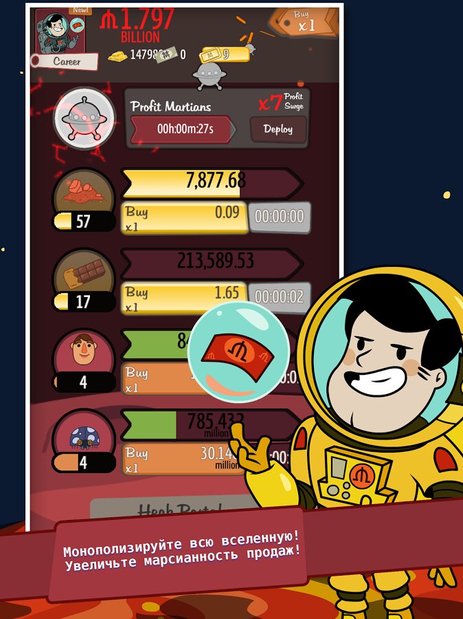 - УЧАСТВУЙТЕ В КОСМИЧЕСКОЙ ГОНКЕ! Отправляйтесь в путешествие на Луну и Марс и открывайте новые инвестиции, улучшения, менеджеров и предметы в космосе.
