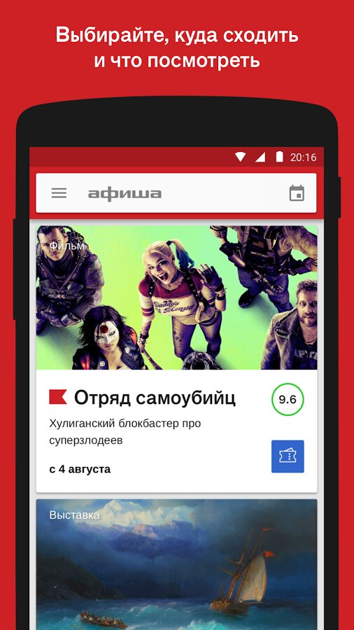 Афиша — идеальный справочник по тому, как провести свой досуг в Москве, Санкт-Петербурге и других городах России. Ежедневно мы освещаем актуальные события в вашем городе: фильмы, концерты, спектакли, выставки, отдых с детьми. Больше у вас не возникнет вопроса, куда сходить. С «Афишей» вы можете не только выбрать развлечение, но и купить на него билеты онлайн, оплатив их как обычной банковской картой, так и с Android Pay.