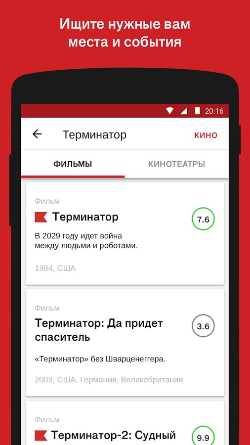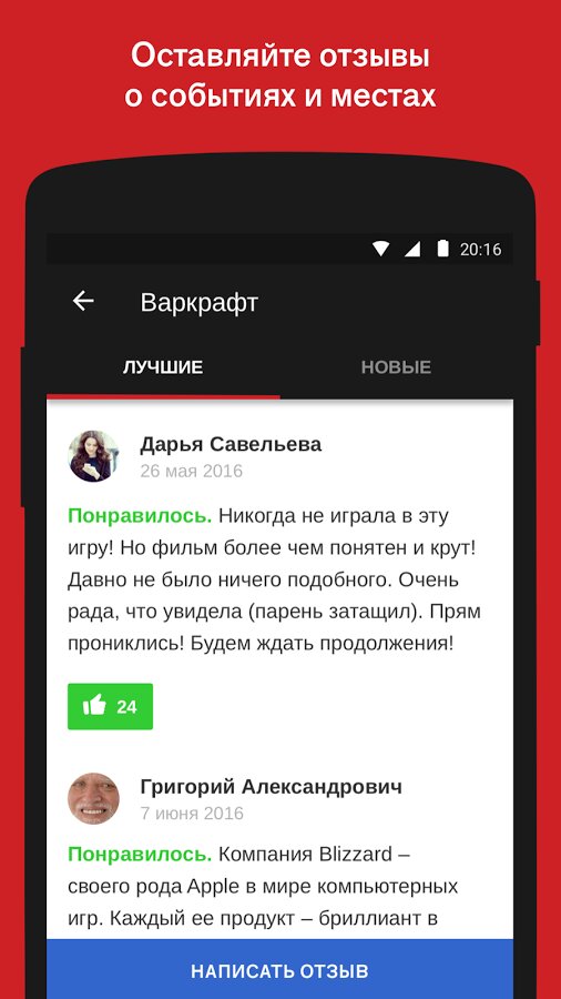 В приложении можно искать как развлечения, так и места: читайте рецензии и отзывы других пользователей на концерты, кинотеатры, клубы, театры и музеи и делитесь своим мнением.И смотрите прямые онлайн трансляции вместе с Афишей.