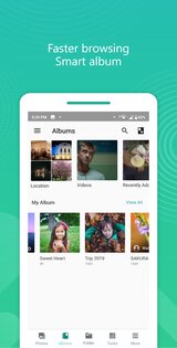 - Интеллектуальные альбомы для автоматической классификации фотографий по местоположению, видео, недавним добавлениям и избранному.