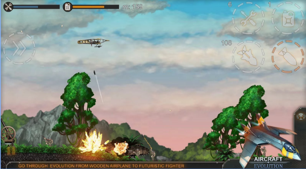 Aircraft Evolution – возьмите под свой контроль военный самолет и проведите его по опасным уровням игры. В этой игре вы побываете в разных временных эпохах и сможете проверить в действии различные самолеты. Летайте над полями сражений и сбрасывайте на врагов обстреливающих вас с земли бомбы. Совершайте невероятные маневры в воздухе, чтобы избежать огня противника. Сбрасывайте бомбы на врага, уничтожая его пехоту, артиллерию, а также такни и другую военную технику. Постоянно следите за уровнем топлива в баке и не забывайте пополнять его. Выполняйте разнообразные миссии и получайте отличное вознаграждение. Открывайте для себя новые самолеты и улучшайте их в своем ангаре.