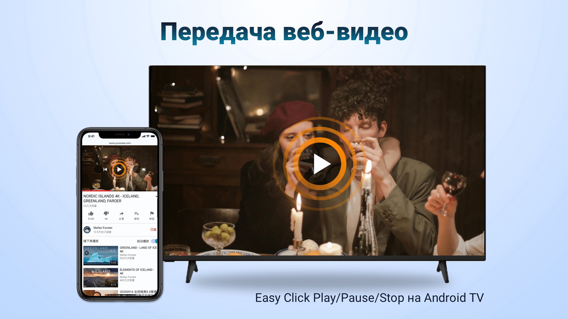- Управление воспроизведением (воспроизведение/пауза/остановка) прямо с принимающего Android TV.