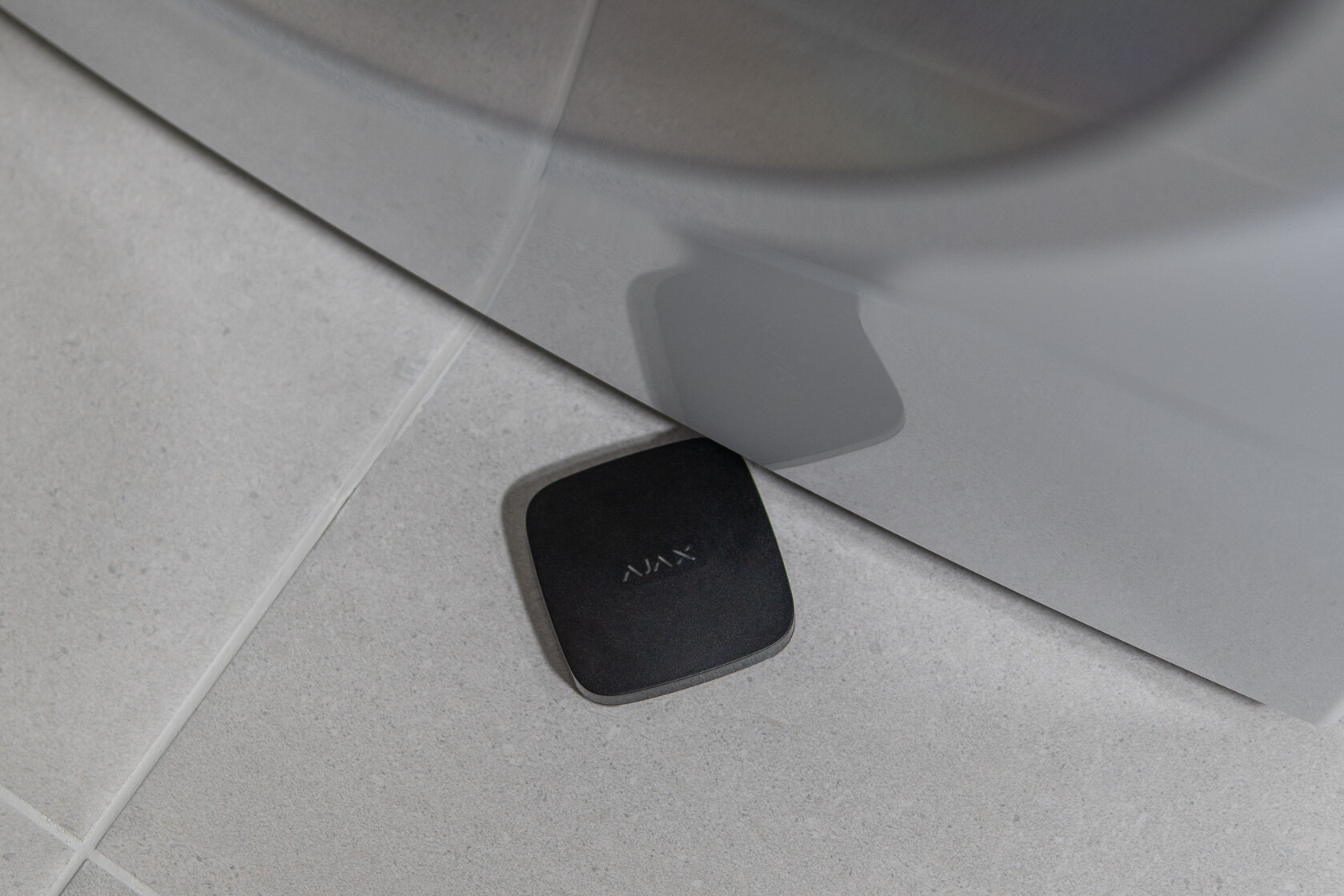 Следом я позаботился о ванной комнате и разместил датчик протекания воды LeaksProtect под стиральной машиной. Благо пластиковая коробочка небольшая и очень тонкая, поэтому с запасом поместилась под машинку. Такие же датчики следует разместить и в других местах вероятного протекания воды: под ванной или под раковинами. Датчик отправляет сигнал не только при намокании контактов, но и при их высыхании.
