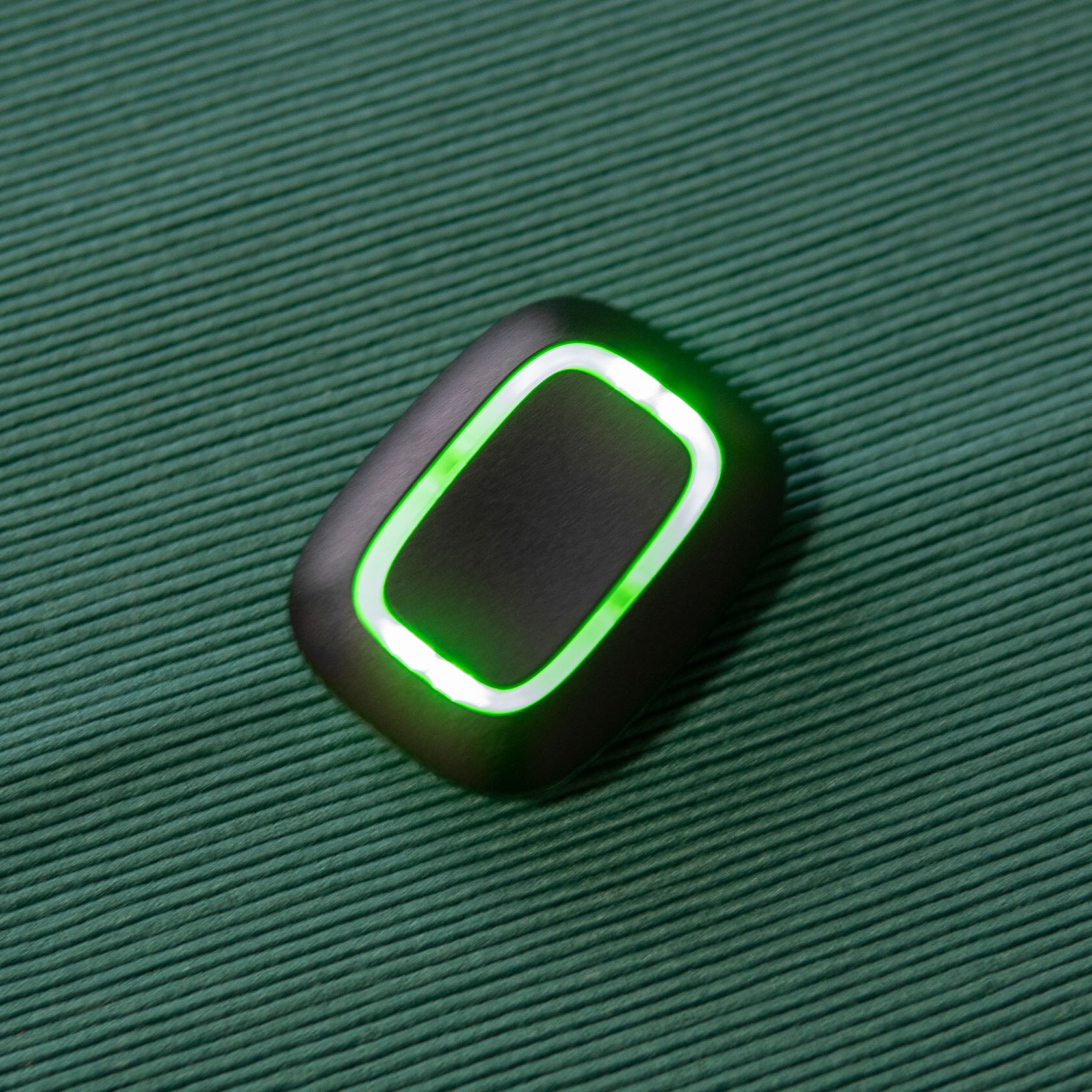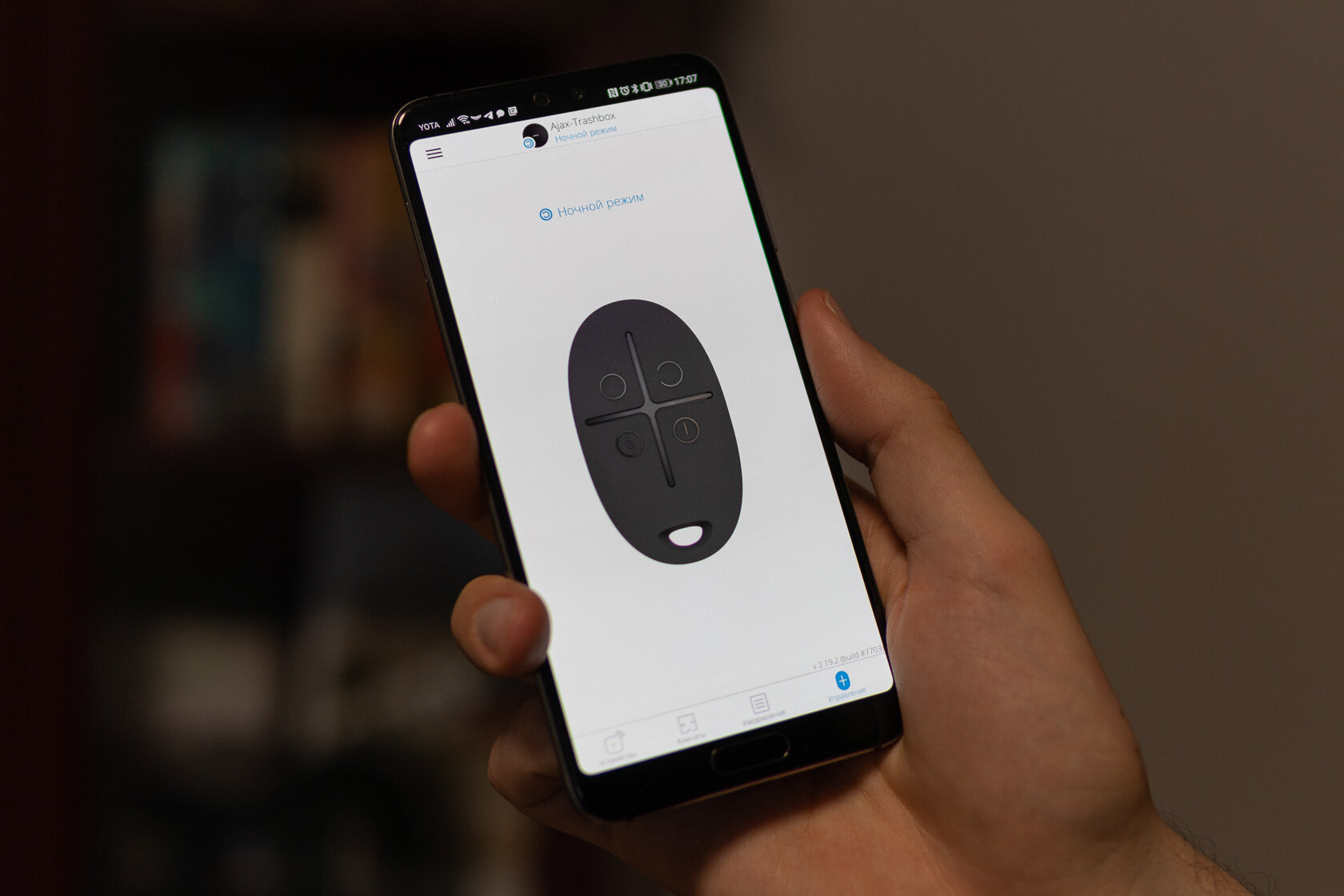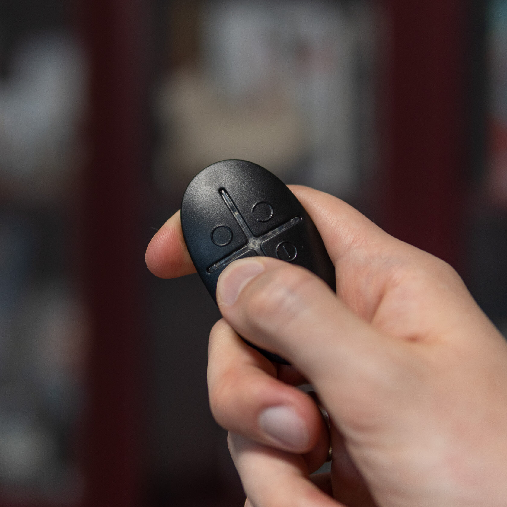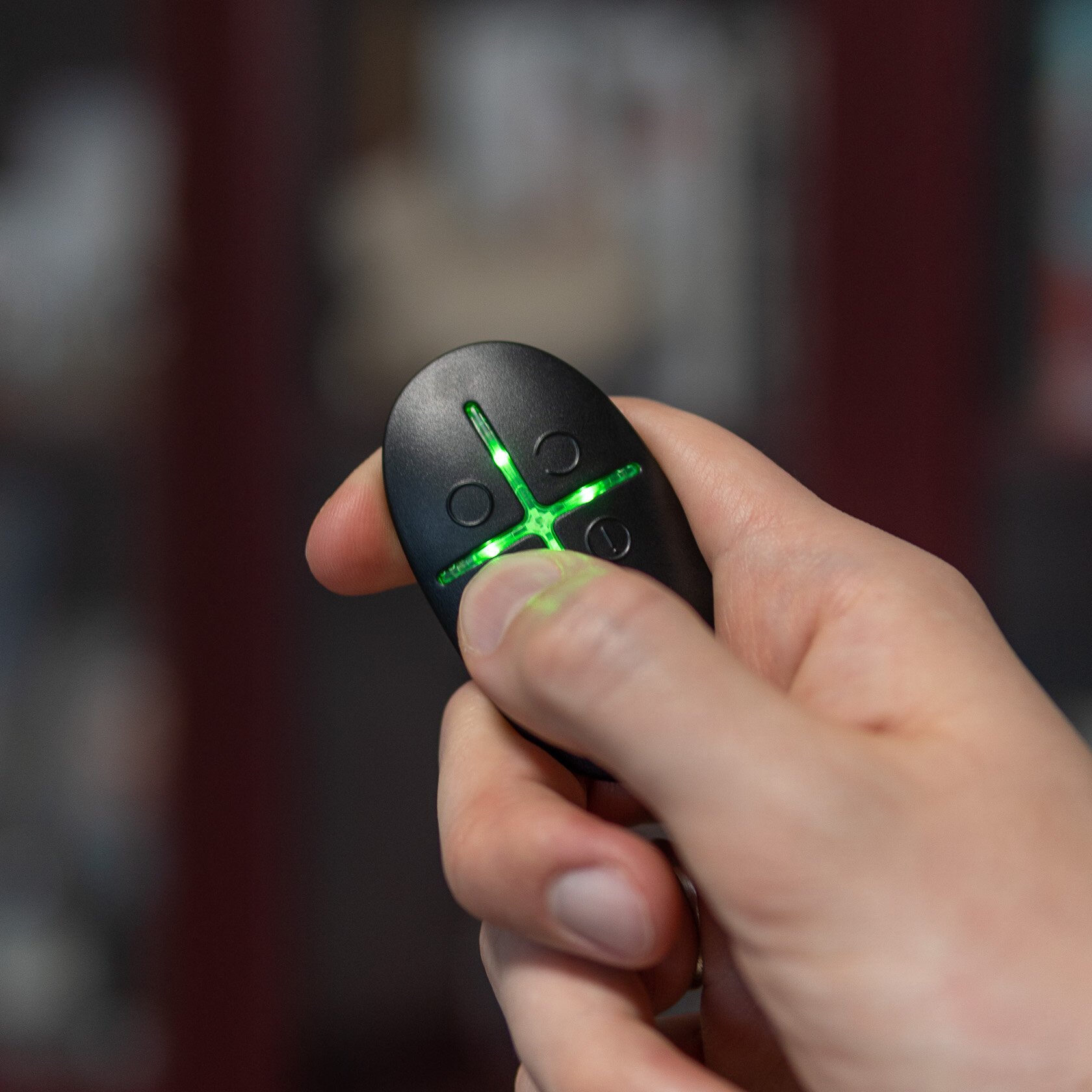 Ajax не полагается только на смартфон, в зоне действия Jeweller на расстоянии до 1300 метров работает пульт-брелок SpaceControl. Четыре клавиши полностью соответствуют приложению. Пульт с обратной связью: первый раз индикатор загорается при нажатии кнопки, второй — после получения сигнала хабом. Задержка между этими действиями составляет около одной секунды.