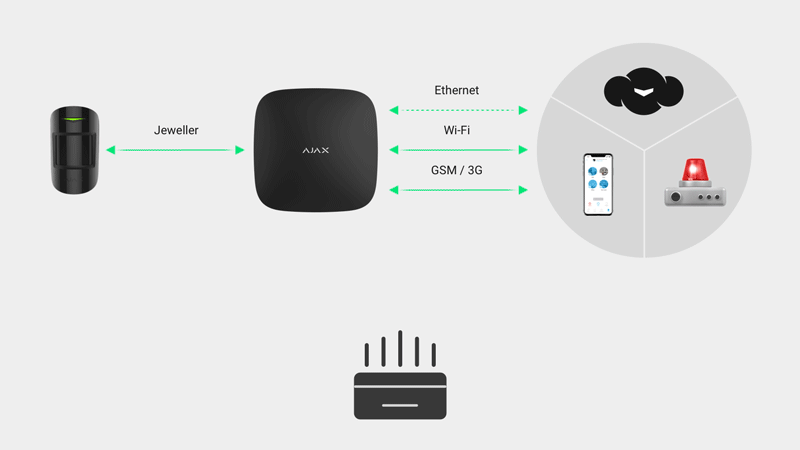 За связь с устройствами отвечает Jeweller — собственный протокол Ajax с дальностью действия до 2000 метров на открытой местности. В отличие от Bluetooth, связь создана специально для охранных систем, поэтому хорошо зашифрована, а также защищена от глушения, вскрытия, подмены устройств и сбоев. В реальной жизни большой радиус действия позволит покрыть несколько этажей многоквартирного дома без дополнительных повторителей. Система учитывает разные комнаты или помещения и суммарно поддерживает до 200 устройств.