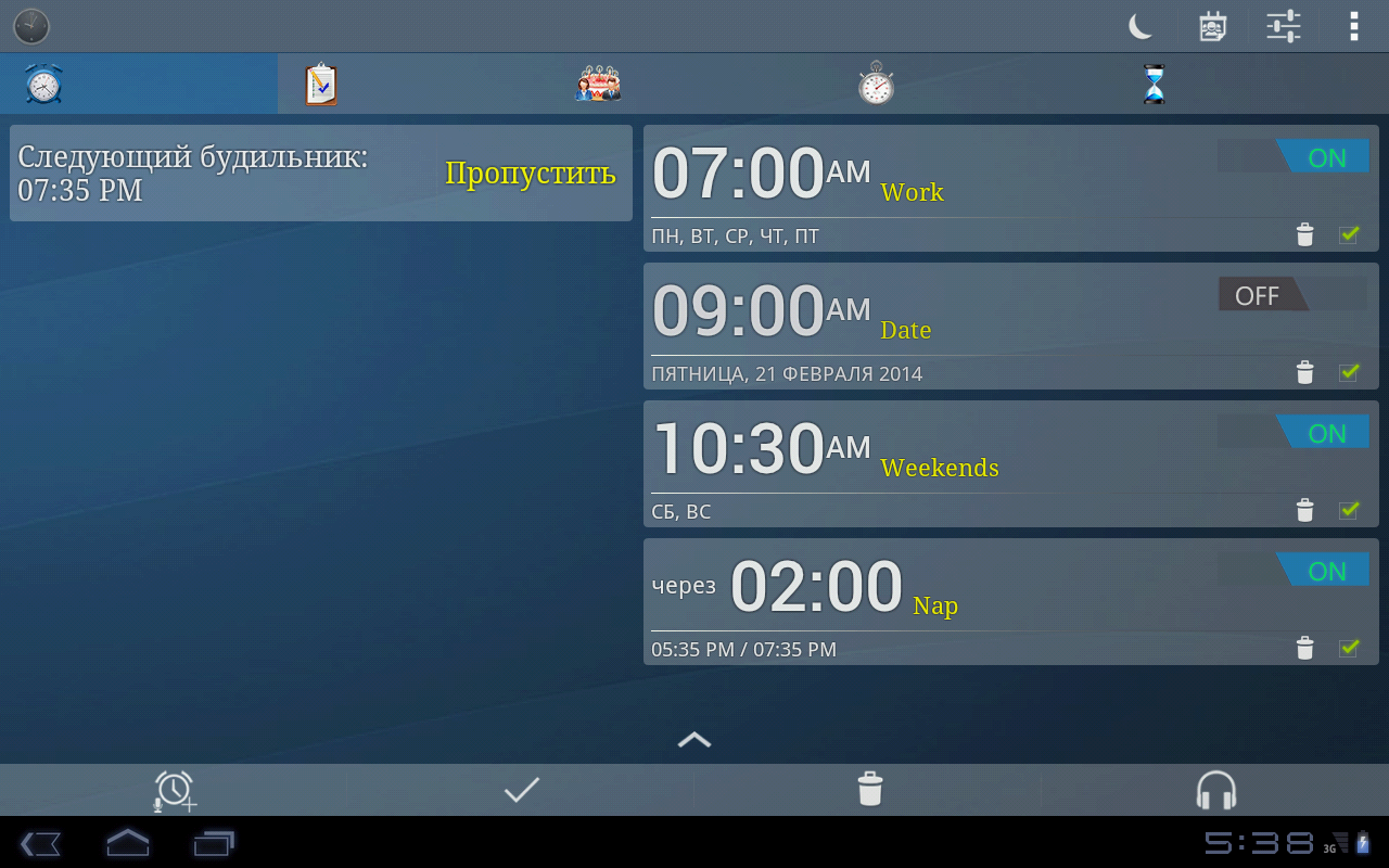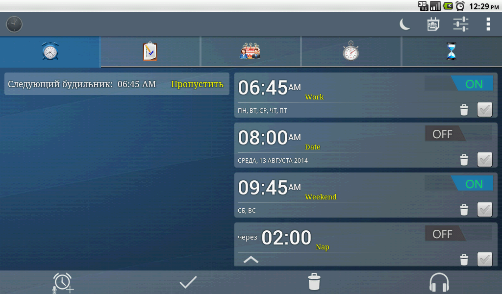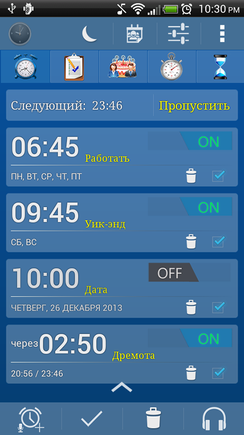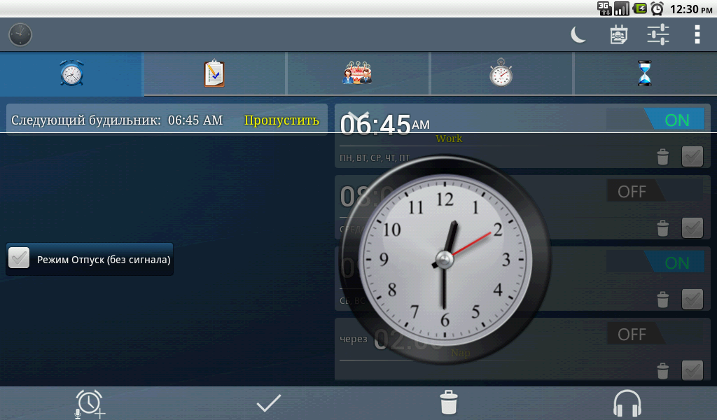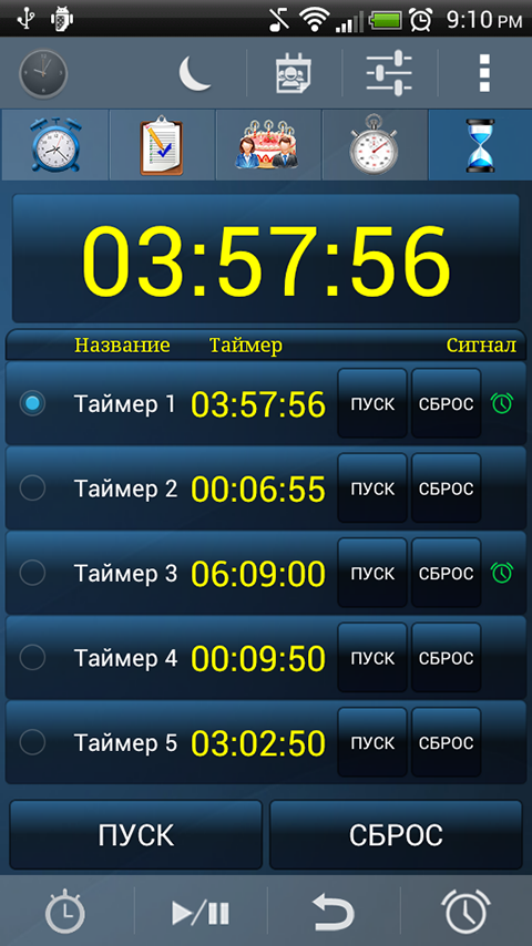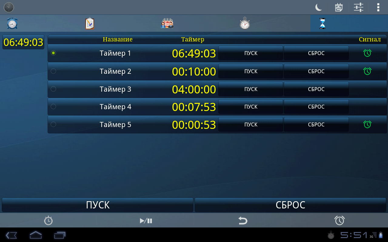 Таймер: можно установить до пяти таймеров с различными параметрами для каждого таймера (набор рингтон, вибрирующих, уведомление, ...).