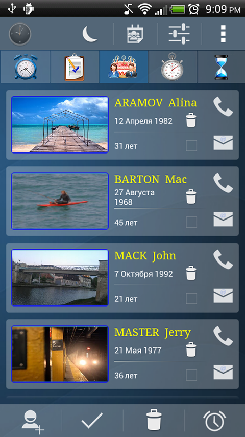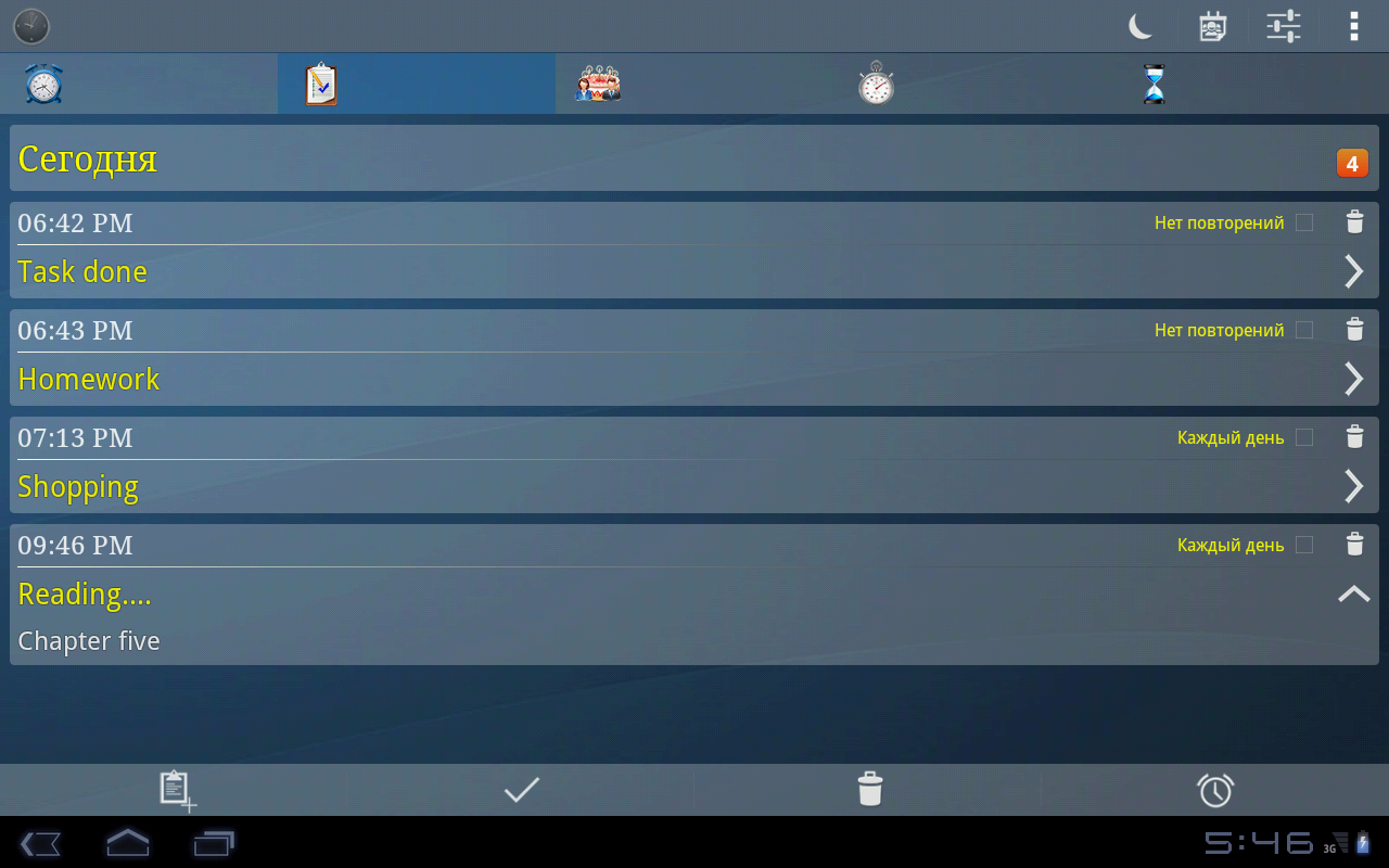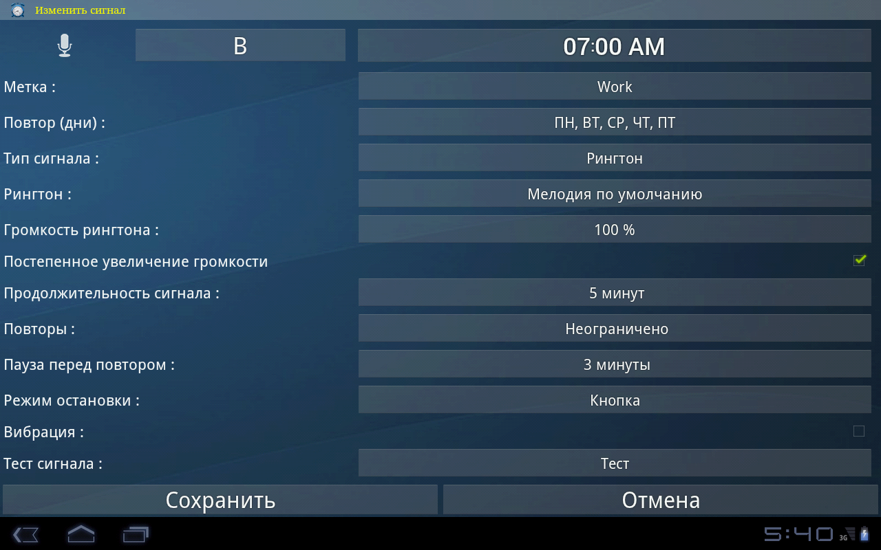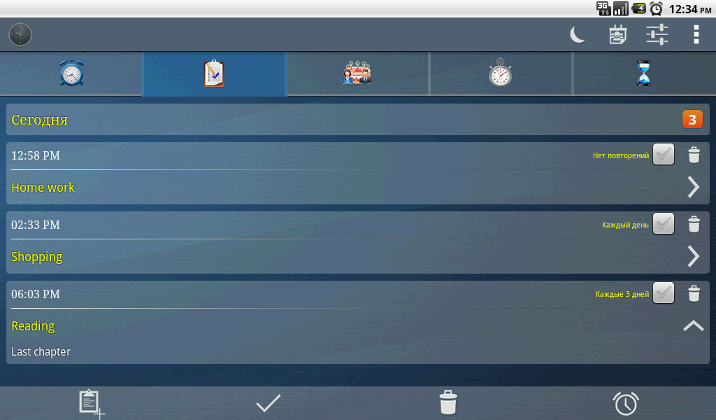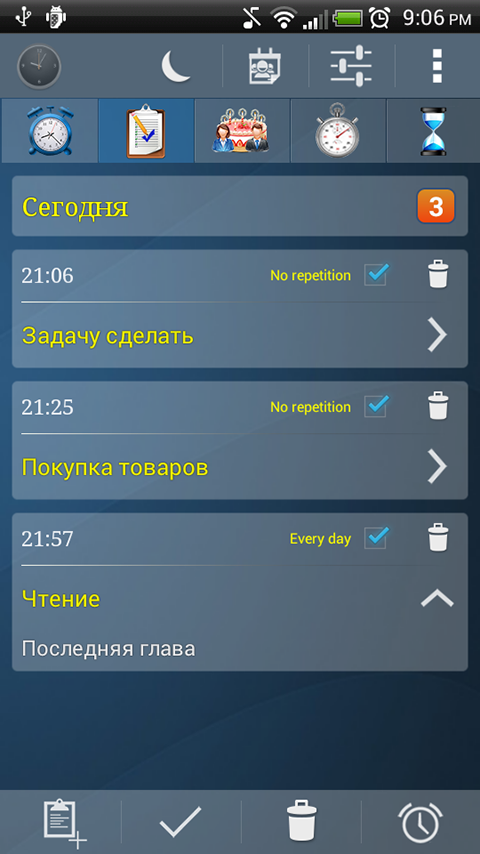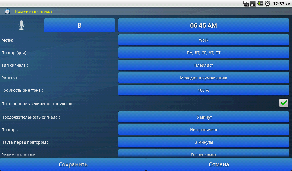 Таймер: можно установить до пяти таймеров с различными параметрами для каждого таймера (набор рингтон, вибрирующих, уведомление, ...).