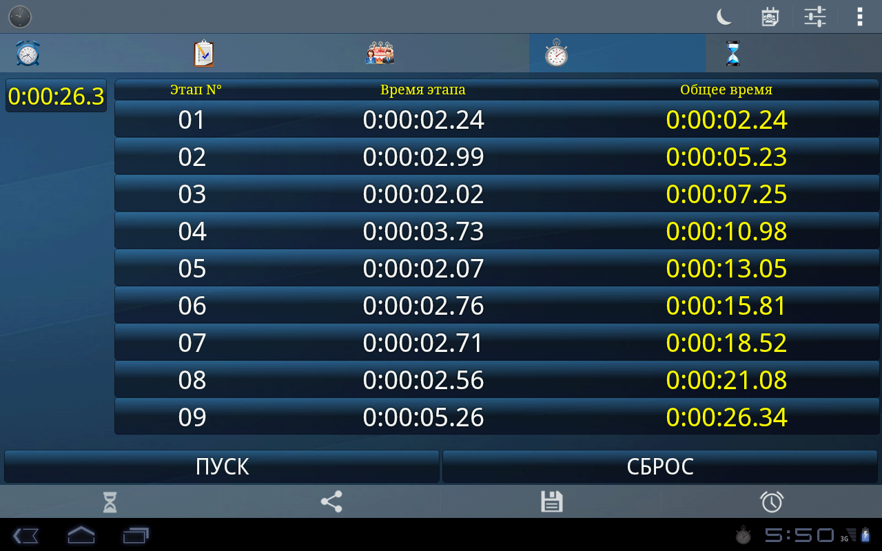Она включает в себя профессиональную секундомер и пять таймеров для ваших повседневных нужд: