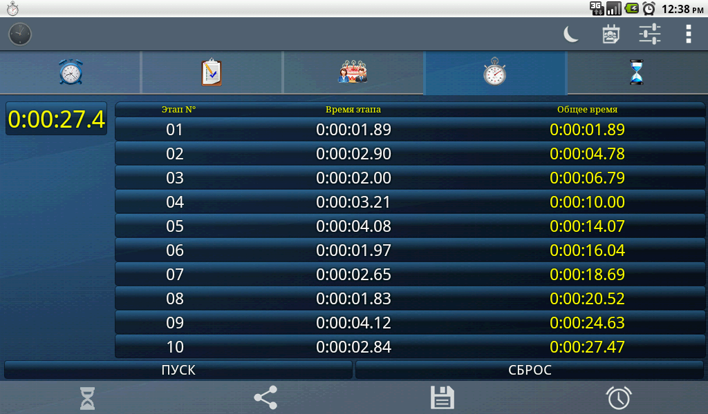 Секундомер: Вы можете записывать кругов, поделиться результатами (простым нажатием на секундомер счетчика) или сохранить их в SD карты (длинный нажмите на секундомер счетчика).