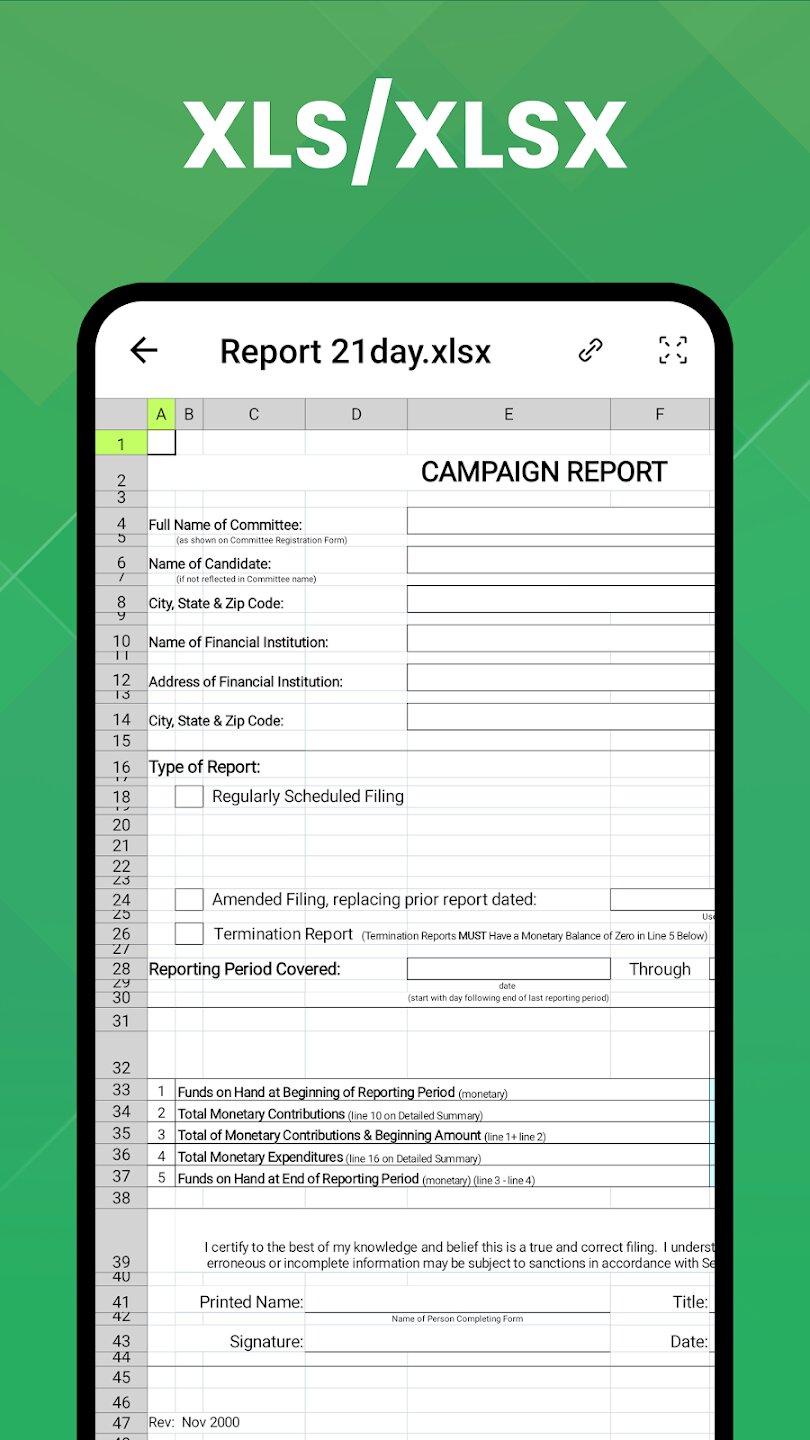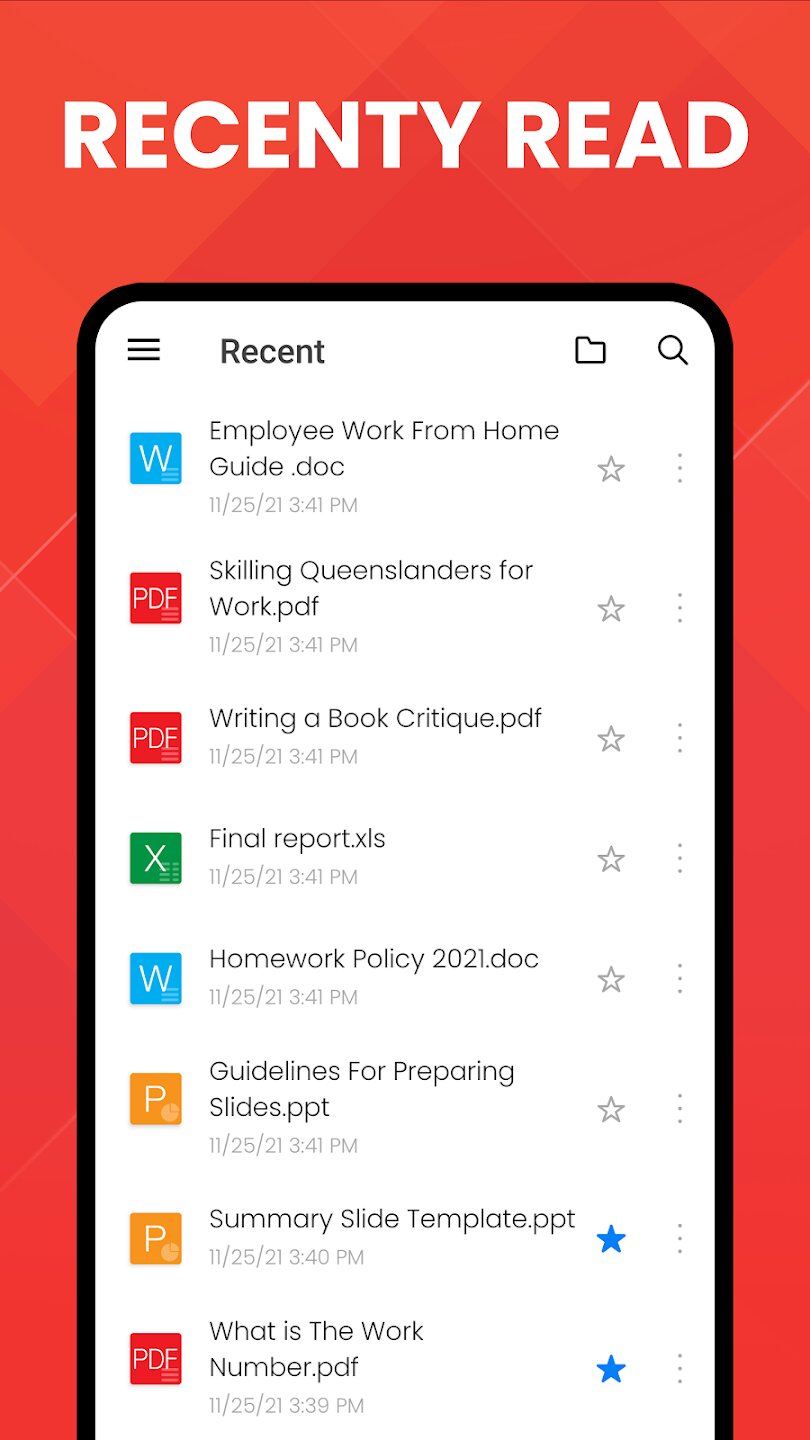 Приложение обеспечивает специализированный просмотр для каждого формата. Читайте файлы DOCX на чистом, элегантном экране, перемещайтесь по PDF-файлам с помощью таких функций, как ночной режим и автоматическое возобновление, просматривайте таблицы Excel с базовыми возможностями редактирования и демонстрируйте слайды из файлов PPT. Оно включает в себя важные инструменты для повышения производительности, такие как функция быстрого поиска файлов, прямая навигация по страницам, элементы управления масштабированием и простые опции для обмена, что делает его практичным помощником для работы или учебы, когда вам нужно получить доступ к документам в пути.