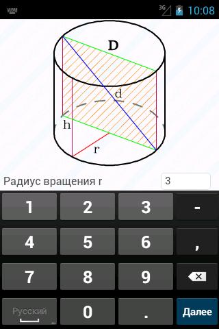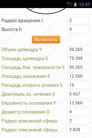 Allcalc Geometry -На сегодняшний день является одним из самых мощных приложений в решении геометрических задач.Программа рассчитывает следующие параметры: Площадь, Объем, Угол, Диагональ, Высоту, Радиус вписанной окружности, Радиус описанной окружности, Катет, Гипотенузу, Радиус описанной сферы, Радиус вписанной сферы, Сторону, Медиану, Биссектрису и т.д.Приложение решает геометрические задачи как плоских фигур, так и объемных тел.Плоские фигуры: Круг, Ромб, Треугольник, Прямоугольник, Трапеция, Квадрат, Параллелограмм, Кольцо, Сектор круга, Сегмент круга, Эллипс.Объемные тела: Цилиндр, Куб, Шар (Сфера), Параллелепипед, Пирамида, Призма, Конус, Тетраэдр, Усеченная пирамида, Усеченный конус, Октаэдр.