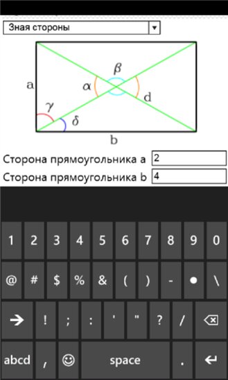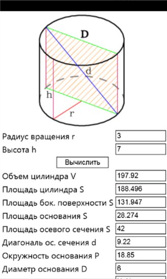- Рассчитывает: Площадь, Объем, Угол, Диагональ, Высоту, Радиус вписанной окружности, Катет, Гипотенузу и тд.