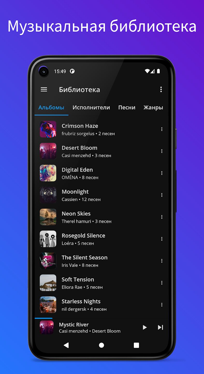 - Просмотр и воспроизведение альбомов, имени исполнителя, жанры;