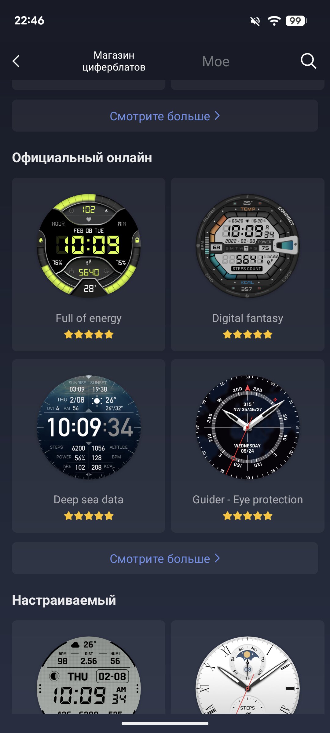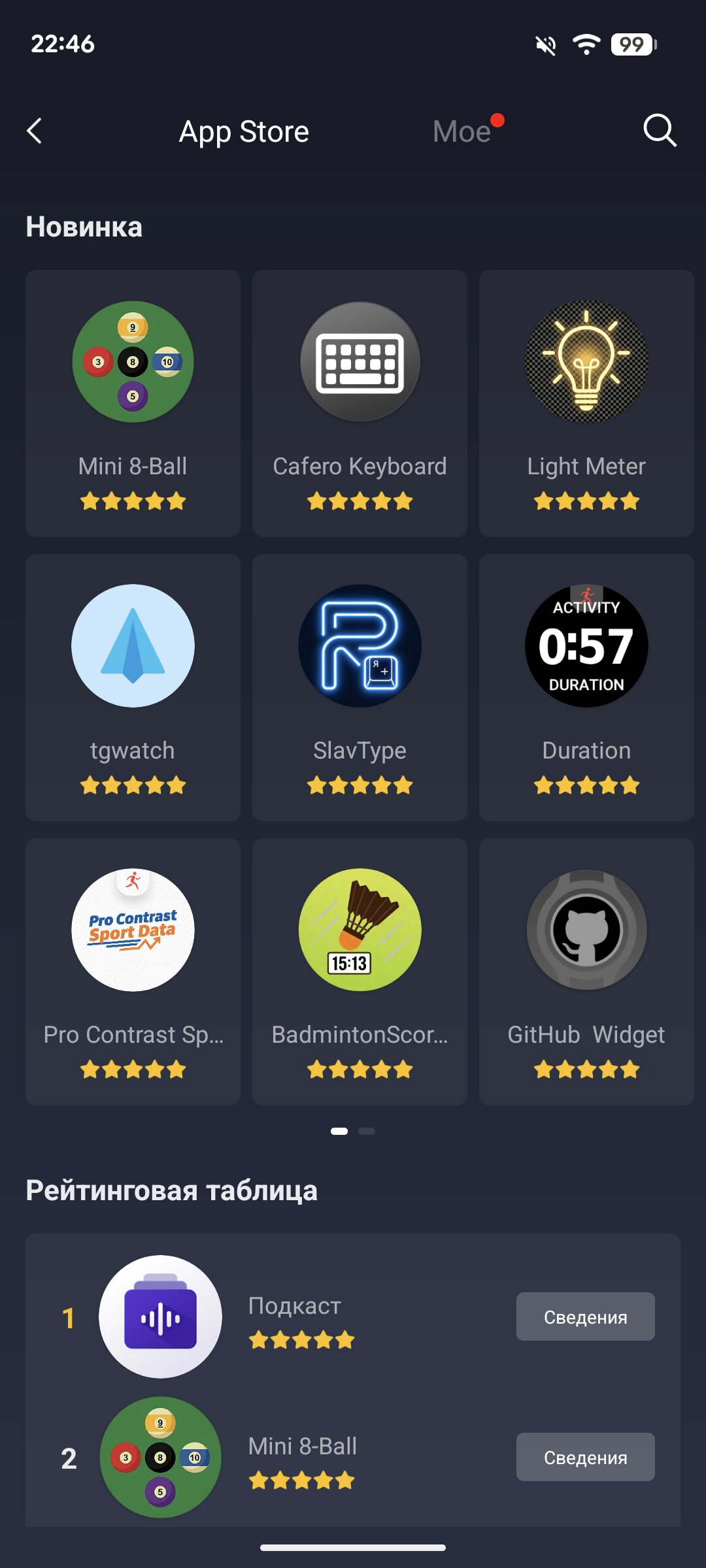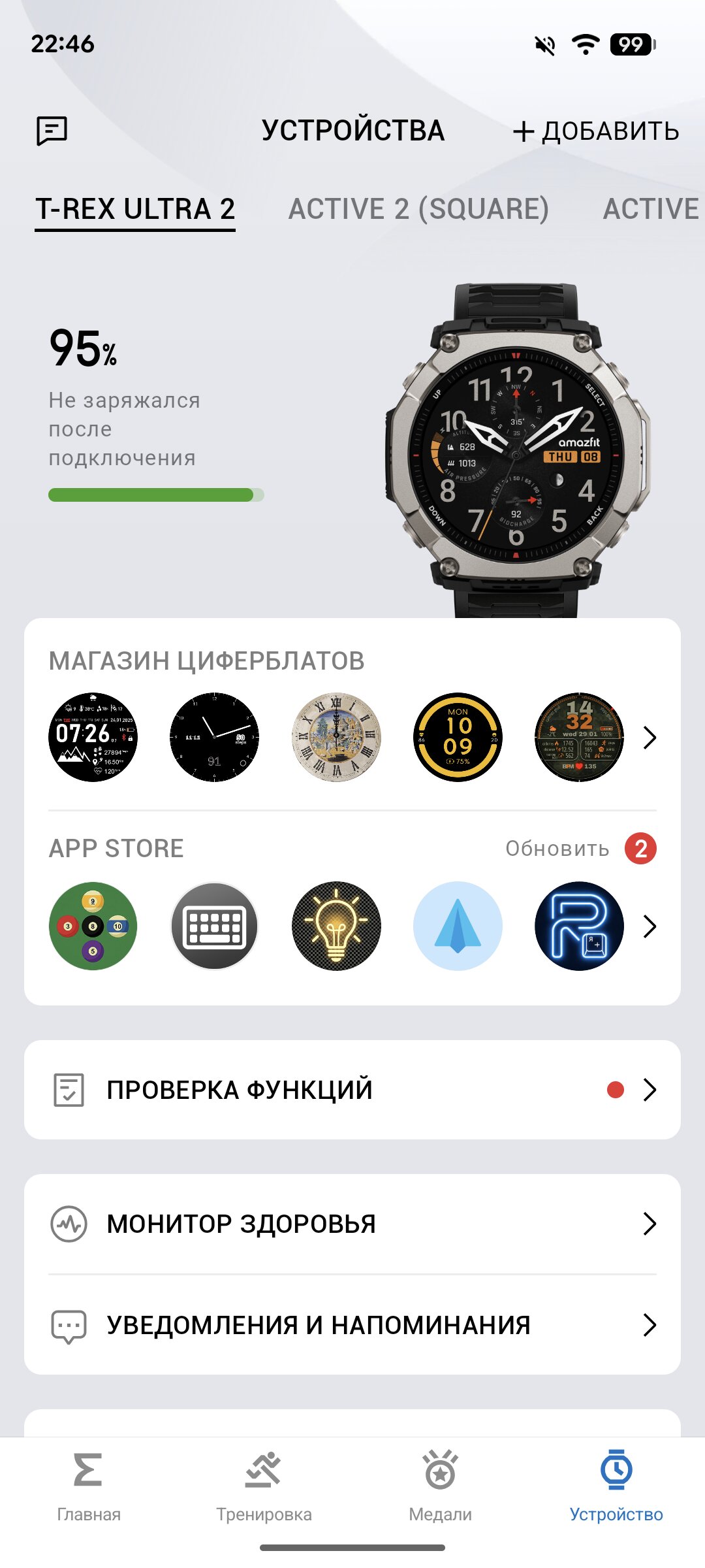 Отдельно отмечу наличие магазина приложений, позволяющего загрузить на часы дополнительные игры и программы от сторонних разработчиков. Это однозначно достоинство Amazfit T-Rex Ultra 2, поскольку многие конкуренты не поддерживают подобного. Конечно, есть и магазин циферблатов, в котором, я думаю, каждый найдёт тот вариант, который нравится именно ему.