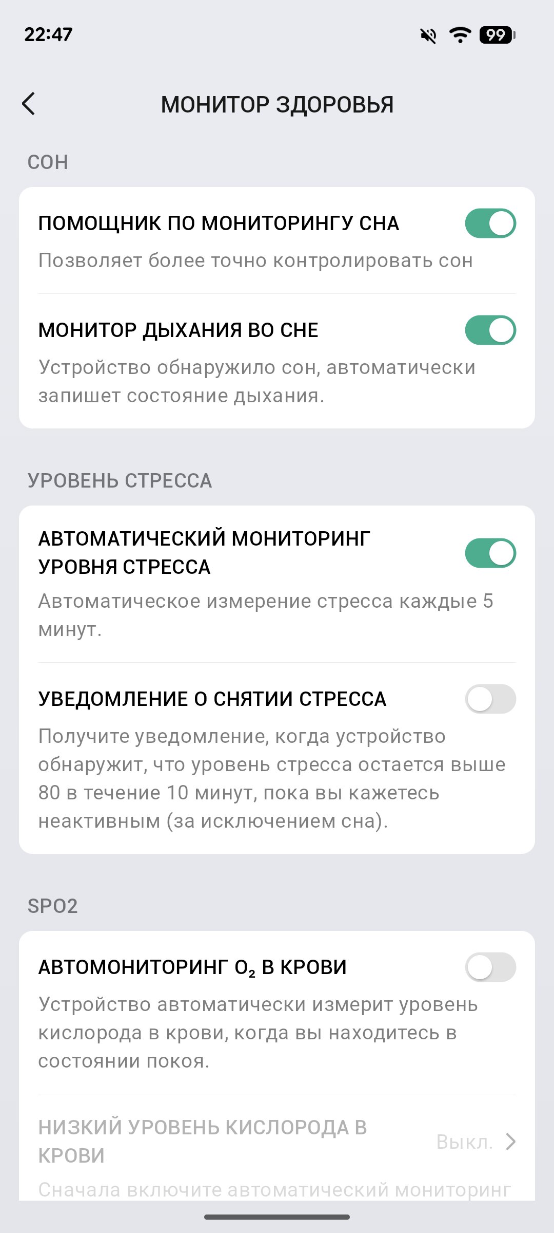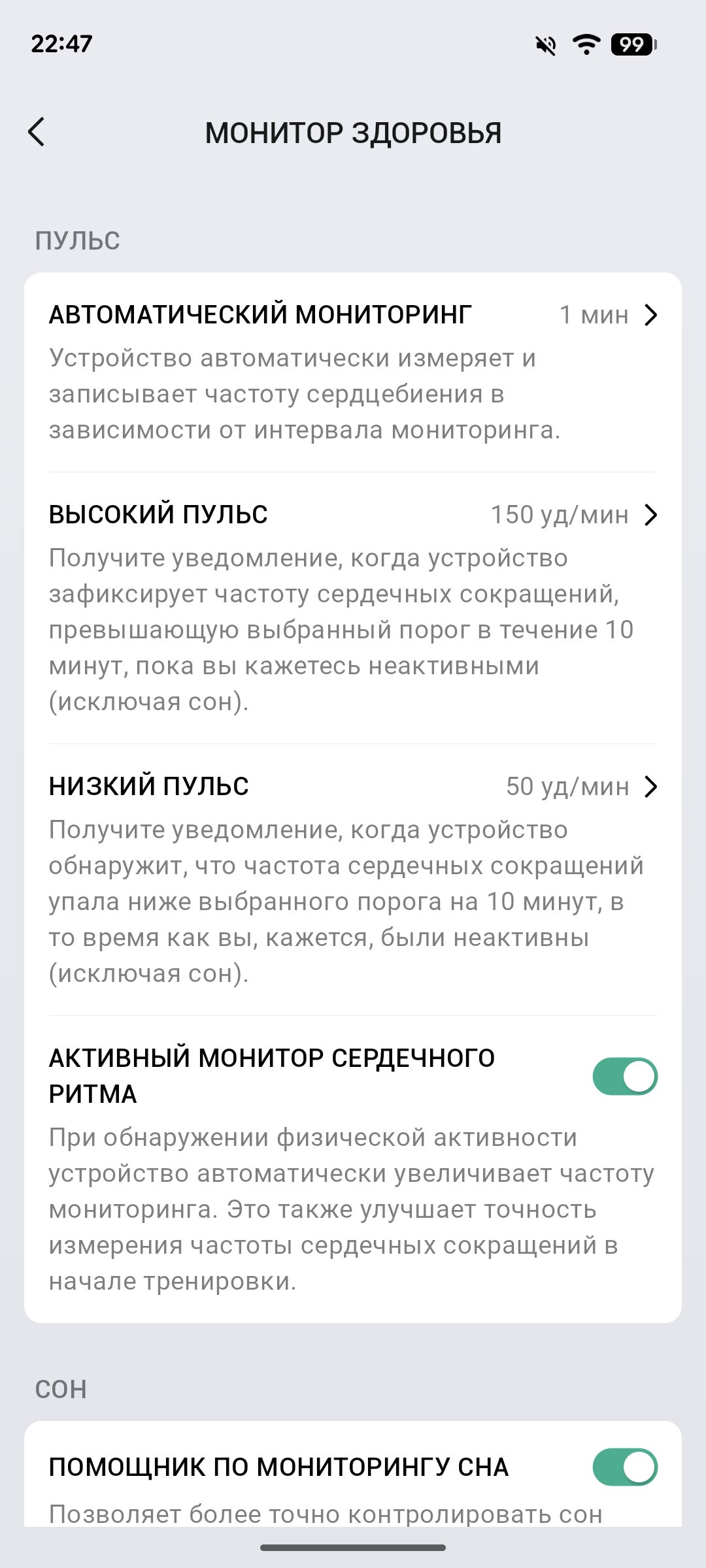 Герой обзора подключается к смартфонам и планшетам на Android и iOS через приложение Zepp по Wi-Fi (2,4 ГГц) и Bluetooth 5.2/LE. Оно позволяет более детально настроить смарт-часы — к примеру, включать/выключать параметры автоматического мониторинга здоровья, задавать опасные пороги для предупреждающего уведомления (например, если пульс поднимается выше или ниже определённого количества ударов в минуту).