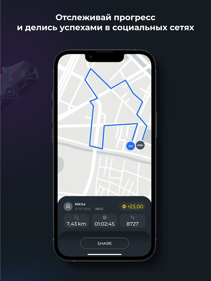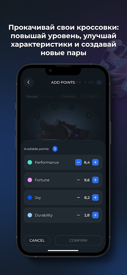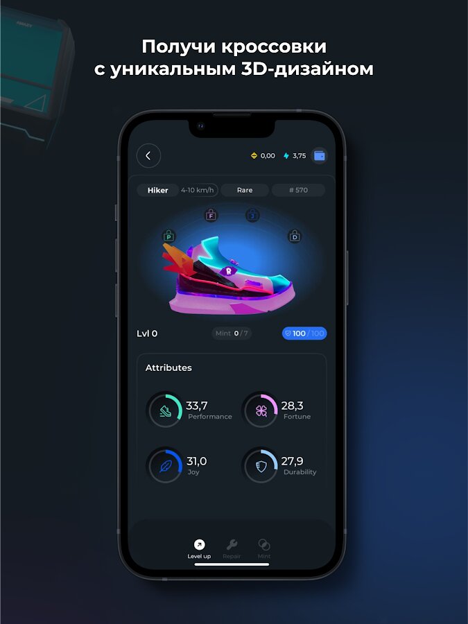 Каждая пара кроссовок имеет уникальный 3D-дизайн и определенный уровень редкости. Прокачивай свою пару: повышай уровень, улучшай характеристики и делись результатами тренировок с друзьями.