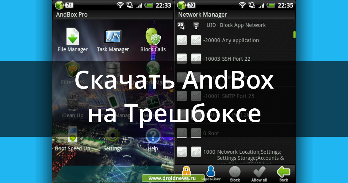 Недавно появилась очень мощная утилита, которая позволяет тонко настраивать и регулировать систему — AndBox. Некоторые из возможностей, которыми она обладает, потребуют рута. Но AndBox существенно расширит вашу власть над андрофоном. Правда, злоупотреблять ей не стоит, так как запросто можно довести телефон до такого состояния, что потребуется полный его сброс.